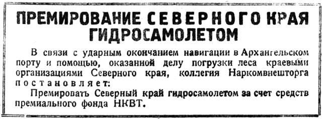 Премировать Северный край гидросамолетом за счет средств премиального фонда НКВТ.