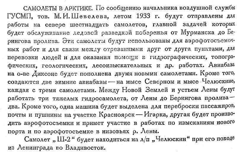 САМОЛЕТЫ В АРКТИКЕ. По сообщению начальника воздушной службы ГУСМП, тов. М. И. Шевелева, летом 1933 г. будут отправлены для работы на севере шестнадцать самолетов, главной задачей которых будет обслуживание ледовой разведкой побережья от Мурманска до Берингова пролива. Эти самолеты будут использованы для аэрофотосъемочных работ и для связи между отрезанными друг от друга пунктами, для перевозки людей и для оказания помощи в гидрографических, топографических, геологических, лесоизыскательных и др. работах. Авиабаза на о-ве Диксоне будет пополнена двумя новыми самолетами. Кроме того, создаются две зимние авиабазы — на мысе Северном и мысе Челюскине, каждая с тремя самолетами. Между Новой Землей и устьем Лены будут работать три тяжелых гидросамолета, от Лены до Берингова пролива — два. Кроме того, одна машина будет выделена для переброски пассажиров, почты и пушнины на участке Красноярск — Игарка, другая будет производить аэрофотосъемки и примет участие в работах по изысканиям нового порта и по аэрофотосъемке в низовьях р. Лены.
