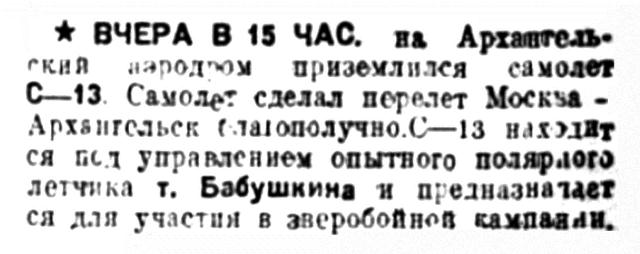 ★ ВЧЕРА В 15 ЧАС. на Архангельский аэродром приземлился самолет С—13. Самолет сделал перелет Москва - Архангельск благополучно. С—13 находится под управлением опытного полярного летчика т. Бабушкина и предназначается для участия в зверобойной кампании.
