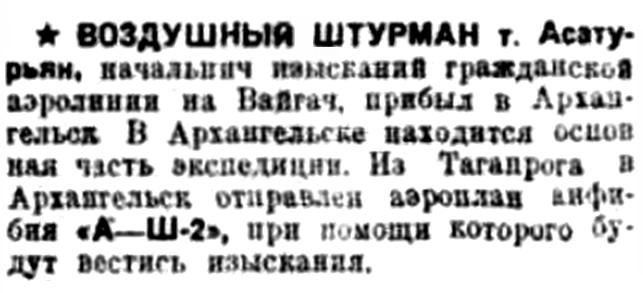 ВОЗДУШНЫЙ ШТУРМАН т. Асатурьян, начальник изысканий гражданской аэролинии на Вайгач, прибыл в Архангельск. В Архангельске находится основная часть экспедиции. Из Таганрога в Архангельск отправлен аэроплан амфибия «А—Ш-2», при помощи которого будут вестись изыскания.