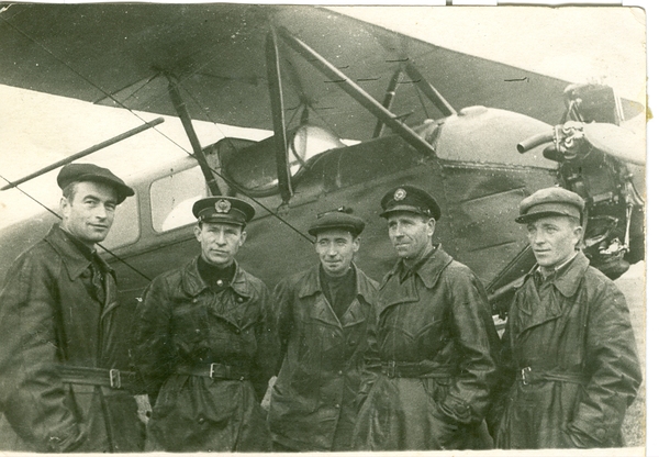Образцы ударной работы показали командир авиозвена Бронский, летчик Цибелев, летчик-наблюдатель лесной инженер Шрамм и мотористы Базин и Сазанов. (ТАСС).