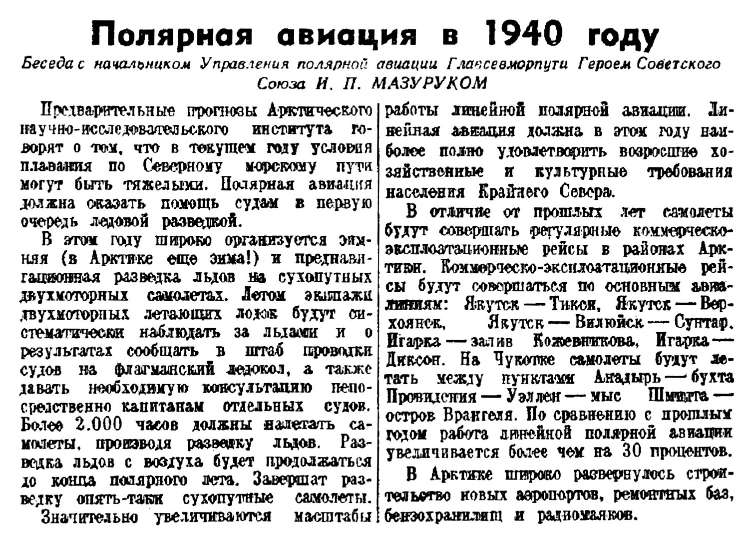— Ледовые разведчики на трех тяжелых самолетах облетали наиболее важные районы великой заполярной магистрали. В разведке приняли участие известные полярные летчики тт. Махоткин, Котов и Бузаев. В результате их работы составлен подробнейший прогноз ледовой обстановки, в которой будет протекать арктическая навигация 1940 года.