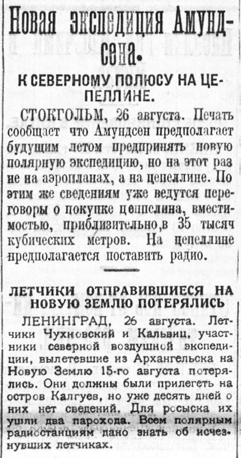 Вопросу о воздушном сообщении на севере, в особенности воздушному сообщению через арктическую полосу, уделяет серьезное внимание Совнаркома Союза. Вопросы этого рода сейчас разрабатываются особой комиссий при Совнаркоме, в которую привлечены иностранные специалисты и выдающиеся исследователи северных морей и земельных пространств. Между прочим в работах комиссии принимал участие Фритьоф Нансен.
