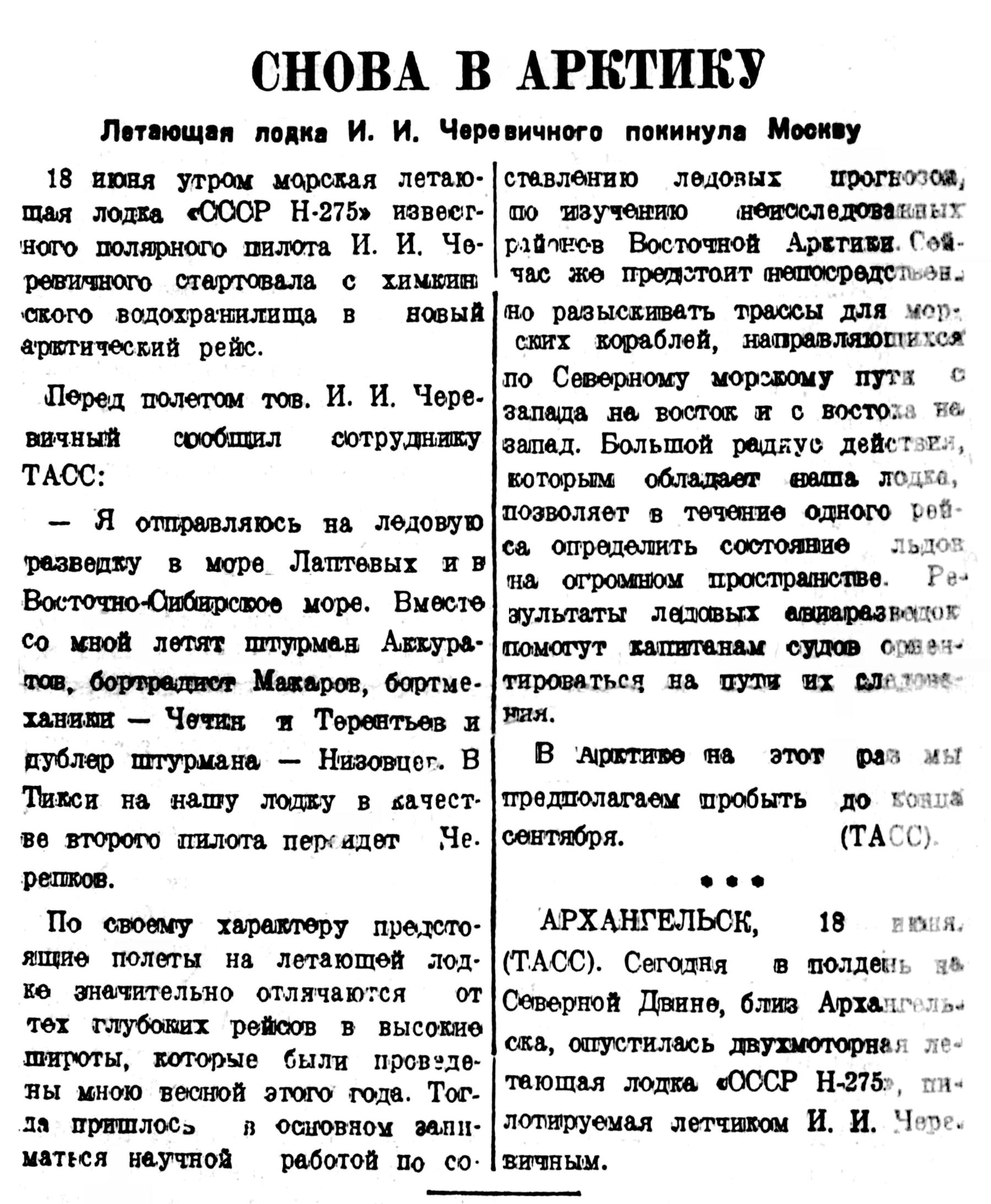 … В письме от 27.6 мною был поставлен вопрос о перегоне по воздуху самолётов через Аляску. Докладываю, что в ближайшие дни нами направляется самолёт Дуглас с квалифицированным лётным составом для изыскания промежуточных посадочных площадок, годных для сухопутных самолётов. Маршрут полёта согласован с УВВС НКО.