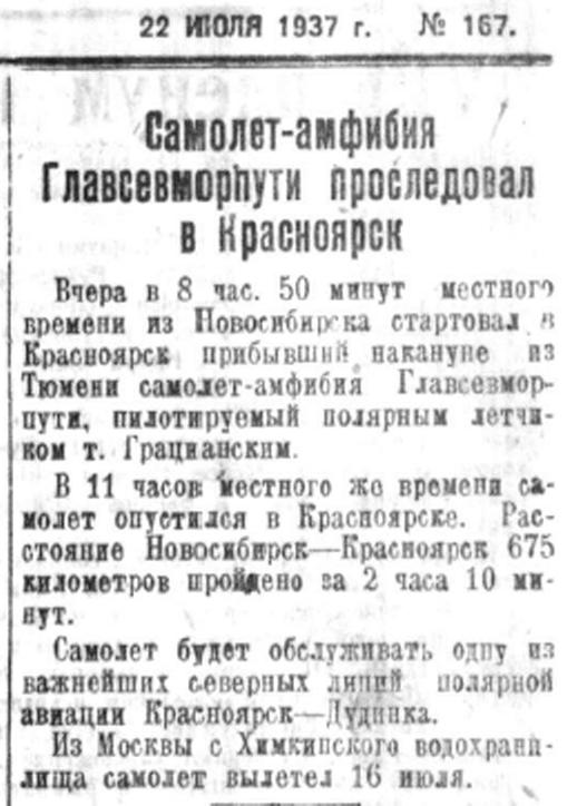 Вчера в 8 час. 50 минут местного времени из Hoвосибирска стартовал в Красноярск прибывший накануне из Тюмени самолет-амфибия Главсевморпути, пилотируемый полярным летчиком т. Грацианским.