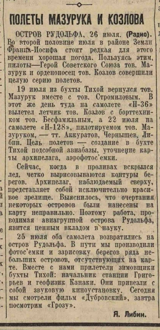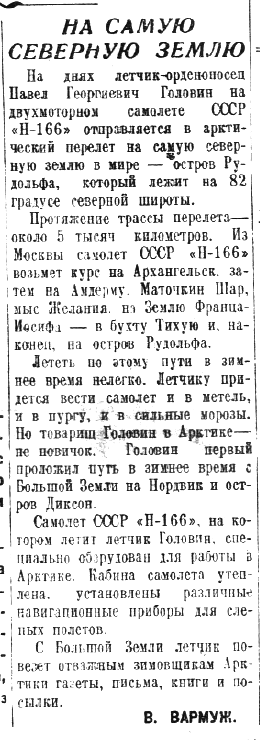 Вчера, в 7 часов 30 минут по местному времени, в очередной северный рейс на Якутск вылетел орденоносный экипаж самолета «Н-29» во главе с лётчиком тов. Черевичным.