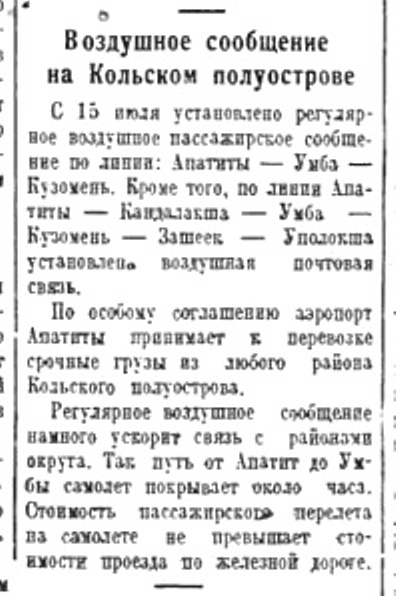 Воздушное сообщение на Кольском полуострове//Полярная правда 16 июля №162 1937