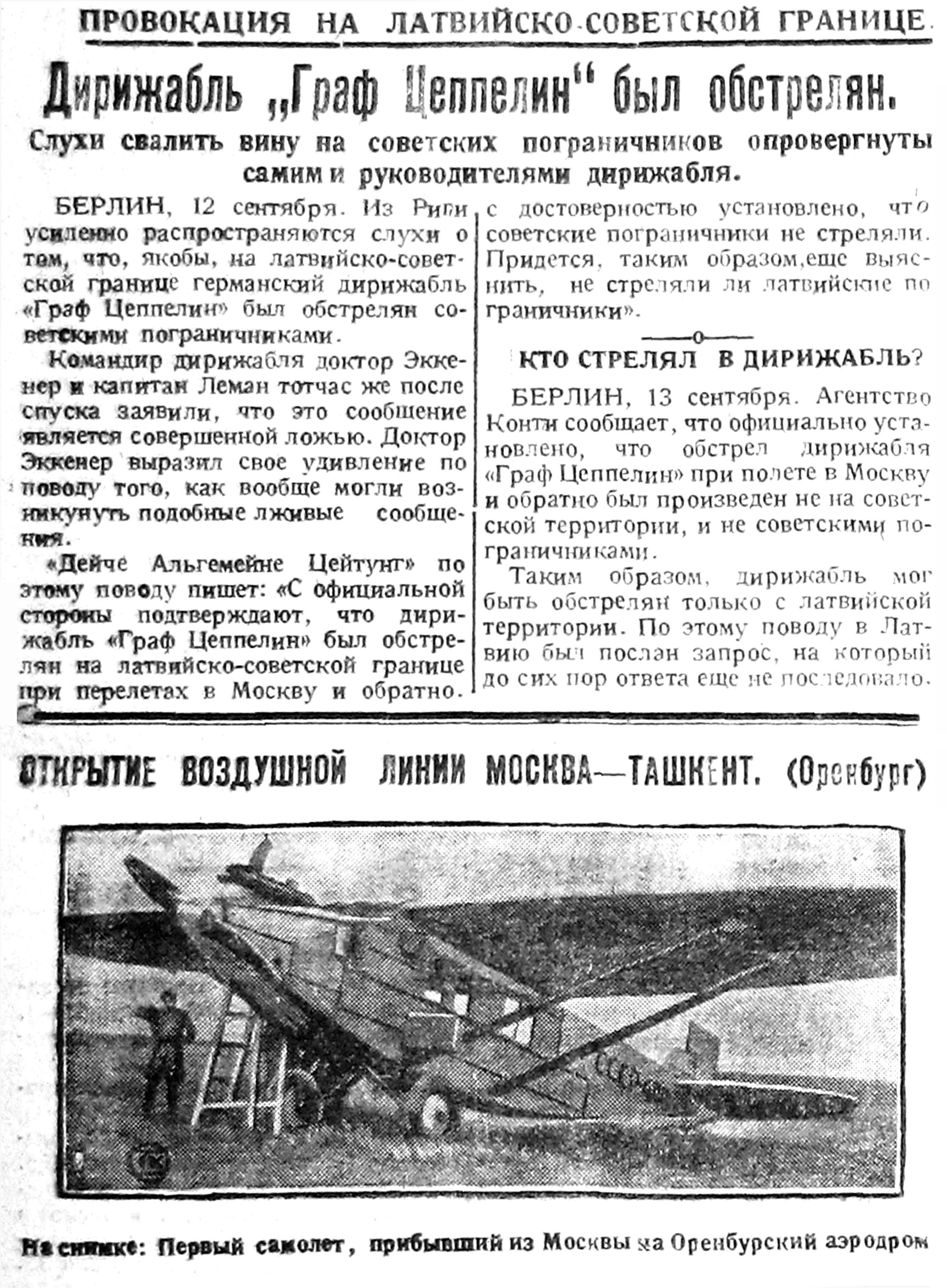 «Дейче Альгемейне Цейтунг» по этому поводу пишет: «С официальной стороны подтверждают, что дирижабль «Граф Цеппелин» был обстрелян на латвийско-советской границе при перелетах в Москву и обратно.