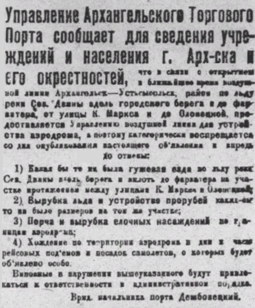 что в связи с открытием в ближайшее время воздушной линии Архангельск — Устьсысольск, район по льду реки Сев. Двины вдоль городского берега и до фарватера, от улицы К. Маркса и до Олонецкой, предоставляется Управлению воздушной линии для устройства аэродрома, а поэтому категорически воспрещается со дня опубликования настоящего объявления и впредь