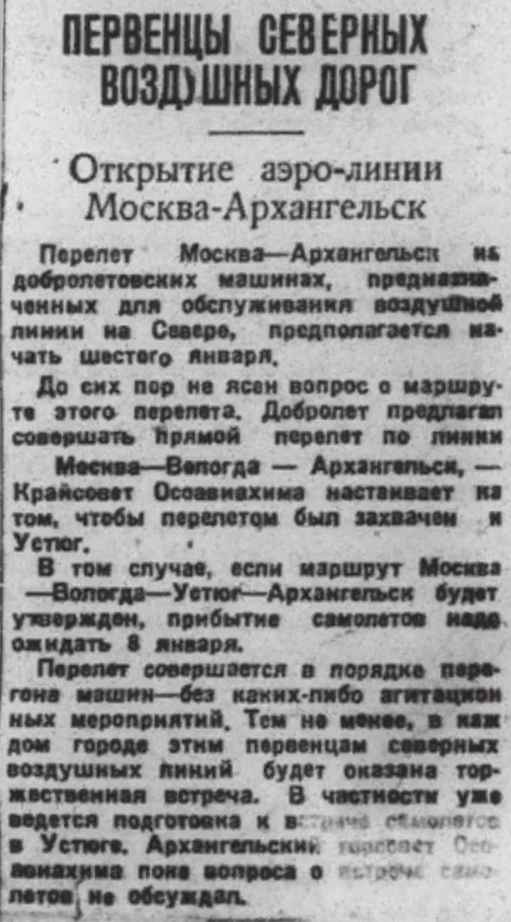 По сообщению начальника Северных воздушных путей самолеты, обслуживающие линию, вылетают из Москвы 8 января. Устюг и Котлас в маршрут перелета на включены и самолет летят через Вологду по железно-дорожной линии прямо в Архангельск. Посадка их на аэродроме против яхт-клуба ожидается завтра или послезавтра. О точном прибытии самолетов будет своевременно извещено.