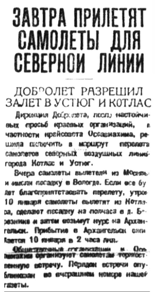 Дирекция Добролета, после настойчивых просьб краевых организаций, в частности крайсовета Осоавиахима, решила включить в маршрут перелета самолетов северных воздушных линий города Котлас и Устюг.