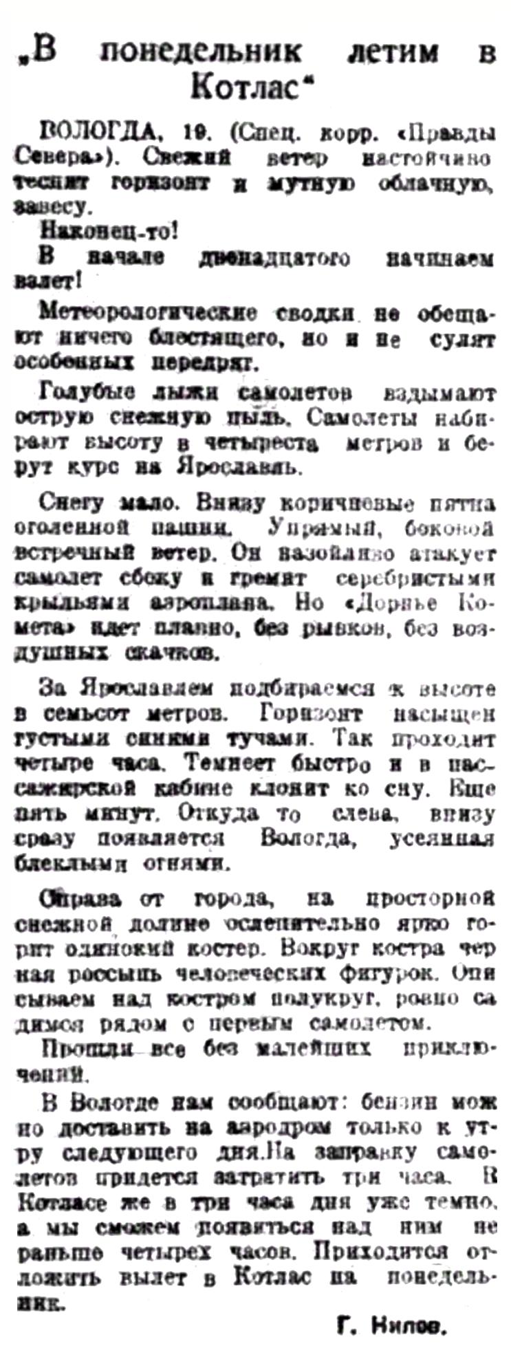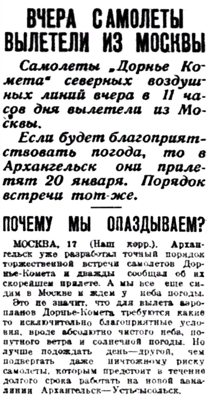 Вчера в 2 часа дня на архангельском морском аэродроме спустился второй самолет "Дорнье-Комета", прибывший из Березника. В Березнике самолет вынужден был задержаться на два дня из-за необходимости сменить магнето в моторе. На пути из Березника в Архангельск самолет попал в полосу непроницаемого тумана. Пришлось снизиться до 100—150 метров и идти по фарватеру Северной Двины. Путь в 300 километров покрыт за три часа. Из Архангельска встретил отставшего товарища первый самолет. Открытие регулярных рейсов по авиолинии Архангельск — Сыктывкар назначено на вторник 28 января. Вчера вечером в клубе водников состоялось торжественное собрание, посвященное открытию линии.