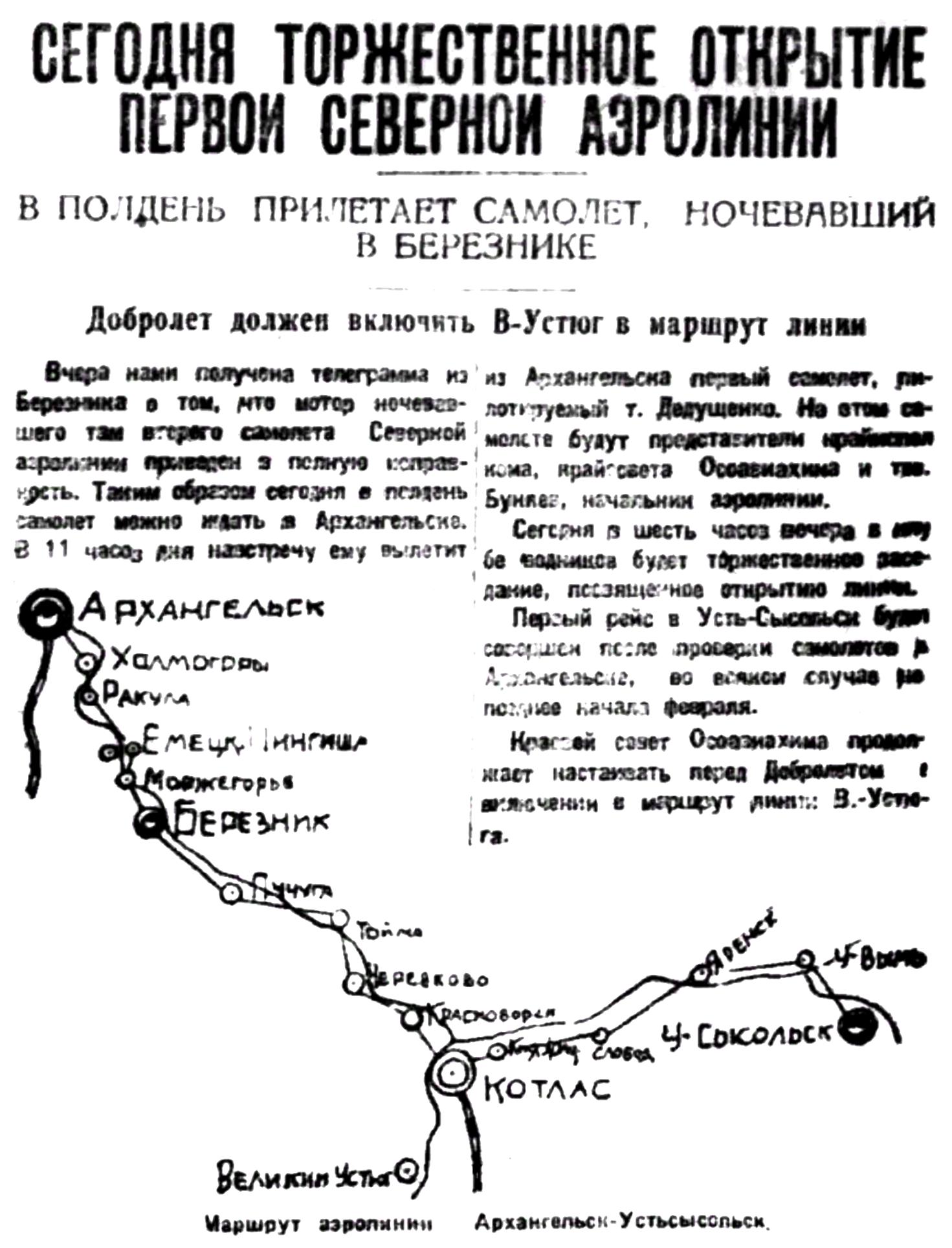 До Котласа оба самолета идут вместе, а от этого пункта один из самолетов свернет на Устьсысольск, а другой на Архангельск с тем, чтобы через короткое время начать регулярные рейсы сразу на двух конечных пунктах новой авиалинии. Вопрос о залете аэропланов в Великий Устюг вряд ли будет разрешен положительно, ибо и так уже потеряно много времени. Самолет, который пойдет на Архангельск, сделает кратковременную посадку в Березнике.