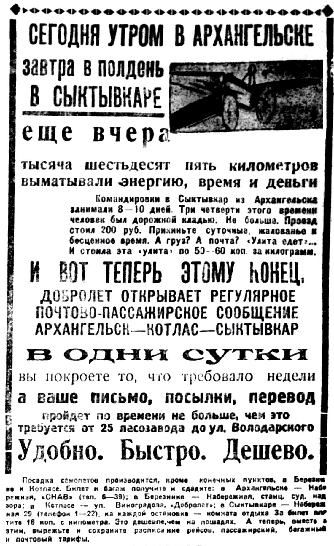 Линия Архангельск — Котлас — Сыктывкар, согласно директиве президиума крайисполкома, должна начать функционировать с первого декабря текущего года. Она будет обслуживаться тремя крупными самолетами системы Юнкерс, самолеты все четырехместные. Перелеты по указанной линии будут совершаться три раза в десятидневку и воздушная поездка из Архангельска в Сыктывкар будет занимать всего около восьми часов.