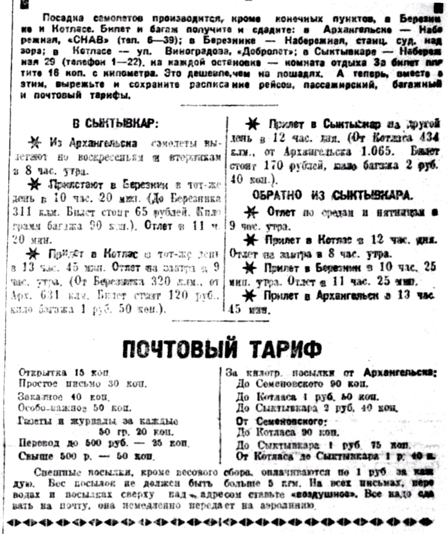 Согласно решению президиума крайисполкома по линии Архангельск — Сыктывкар будет две остановки — Березники и Котлас и, кроме того, самолетами будет производиться спуск почты в соответствующих районах центров.
