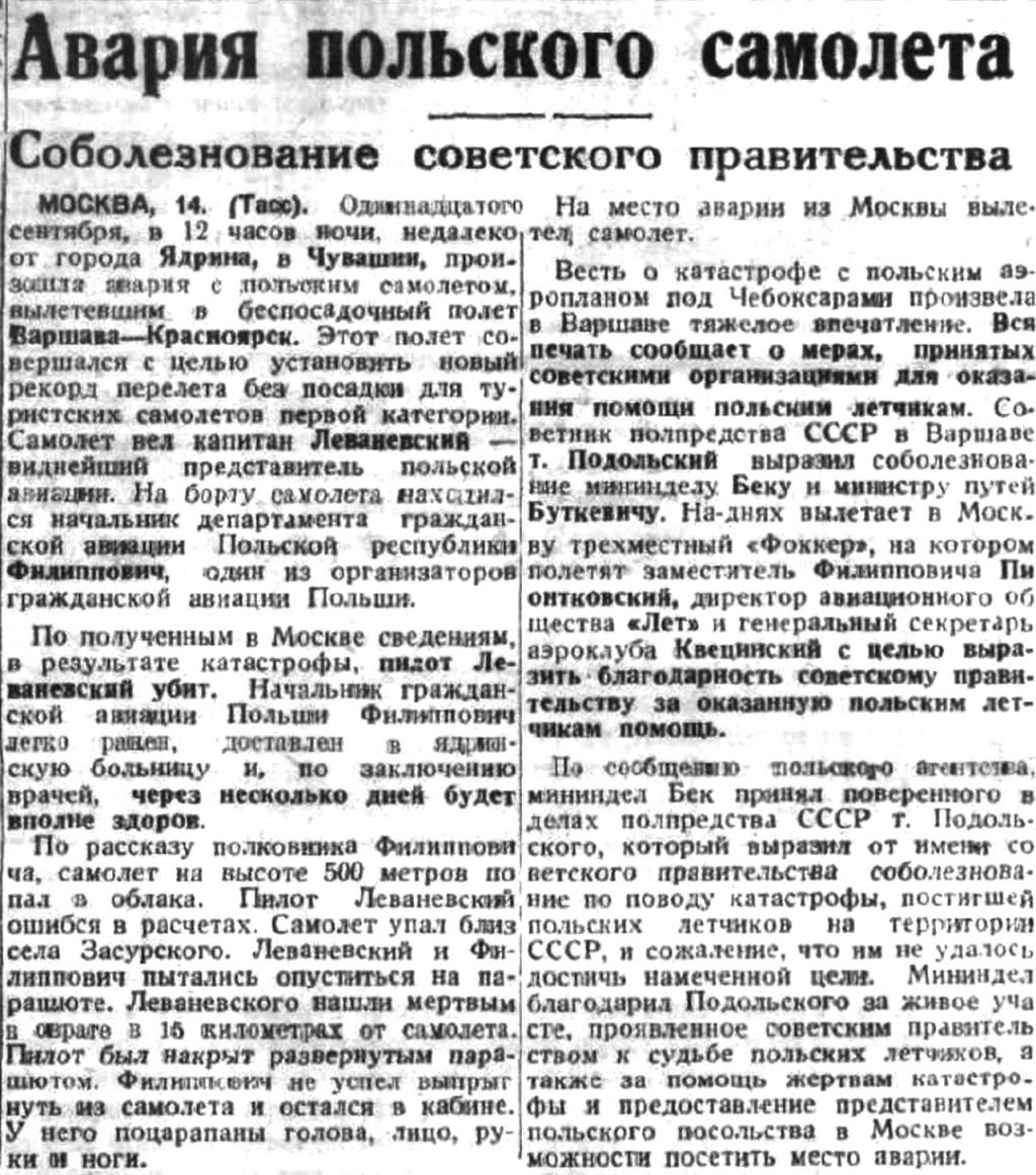 МОСКВА, 14. (Тасс). Одиннадцатого сентября, в 12 часов ночи, недалеко от города Ядрина, в Чувашии, произошла авария с польским самолетом, вылетевшим в беспосадочный полет Варшава—Красноярск. Этот полет совершался с целью установить новый рекорд перелета без посадки для туристских самолетов первой категории. Самолет вел капитан Леваневский — виднейший представитель польской авиации. На борту самолет находился начальник департамента гражданской авиации Польской республики Филиппович, один из организаторов гражданской авиации Польши.