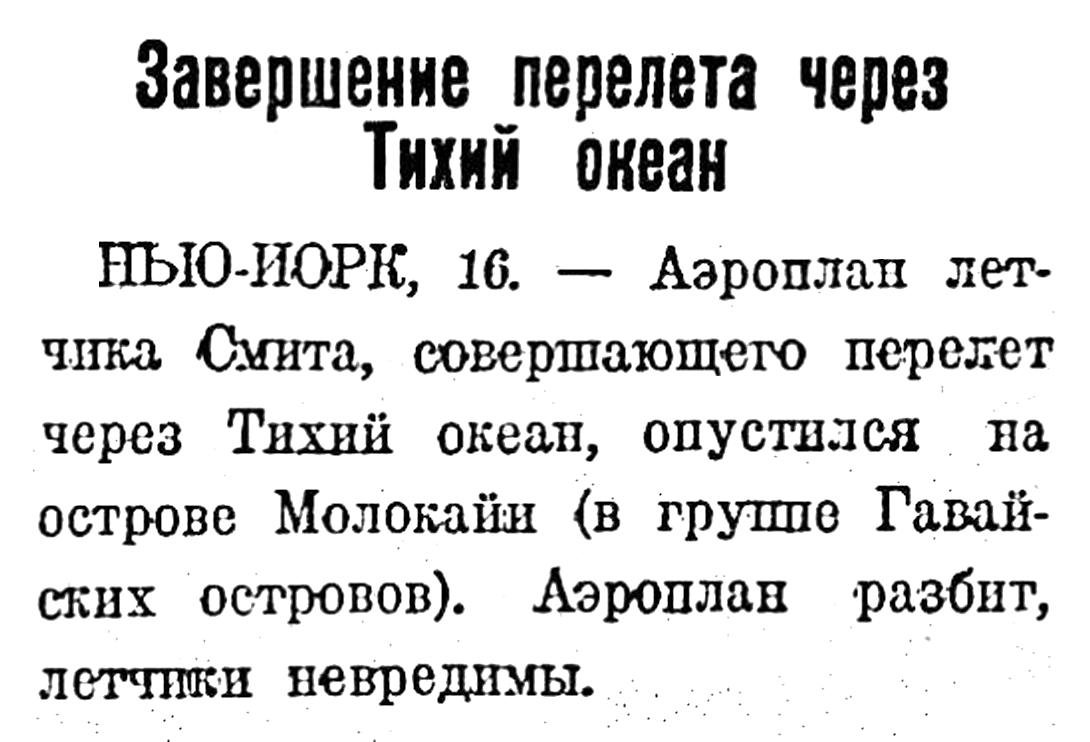 Нью-Йорк, 18 августа. Два из 4 аэропланов, вылетевших из Сан-Франциско в Гонолулу, прибыли в Гонолулу. Победивший летчик покрыл расстояние и 2.400 миль лишь в 26 часов 17 минут. Два остальных аэроплана пропали. Повидимому, они утонули в Тихом океане, вследствие нехватки газолина.