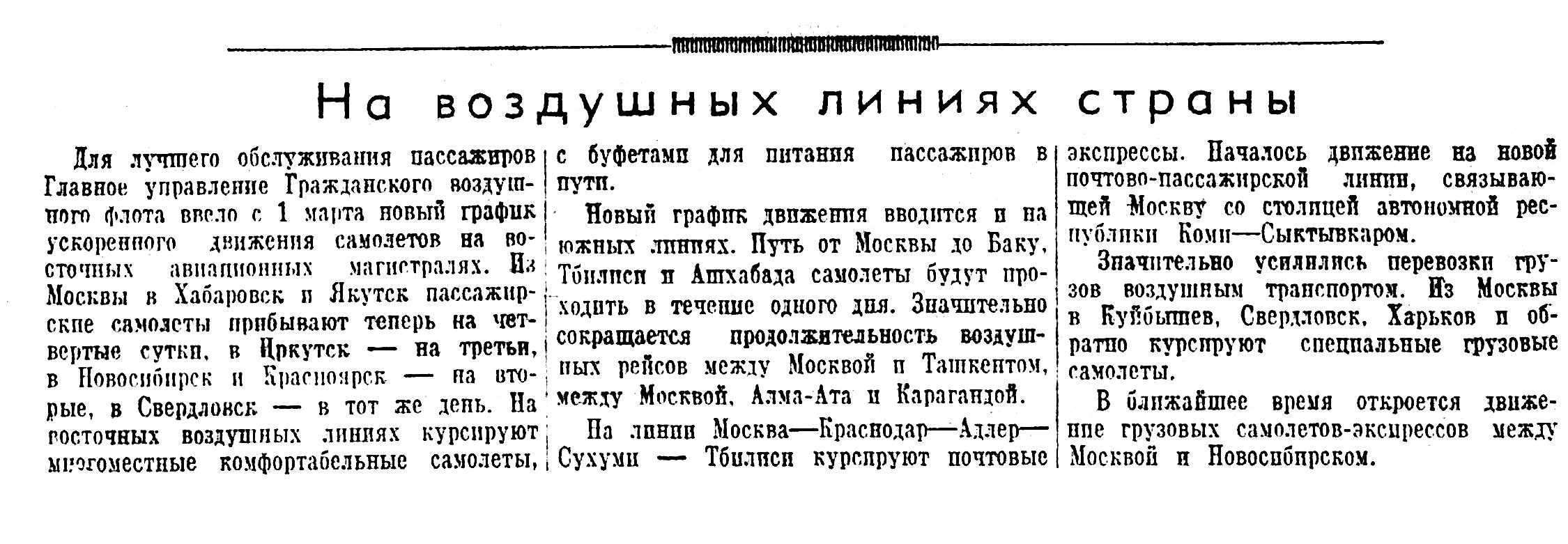 Для лучшего обслуживания пассажиров Главное управление Гражданского воздушного Флота ввело с 1 марта новый график ускоренного движения самолетов на восточных авиационных магистралях. Из Москвы в Хабаровск и Якутск пассажирские самолеты прибывают теперь на четвертые сутки, в Иркутск — на третьи, в Новосибирск и Красноярск — на вторые, в Свердловск — в тот же день. На восточных воздушных линиях курсируют многоместные комфортабельные самолеты, с буфетами для питания пассажиров в пути.