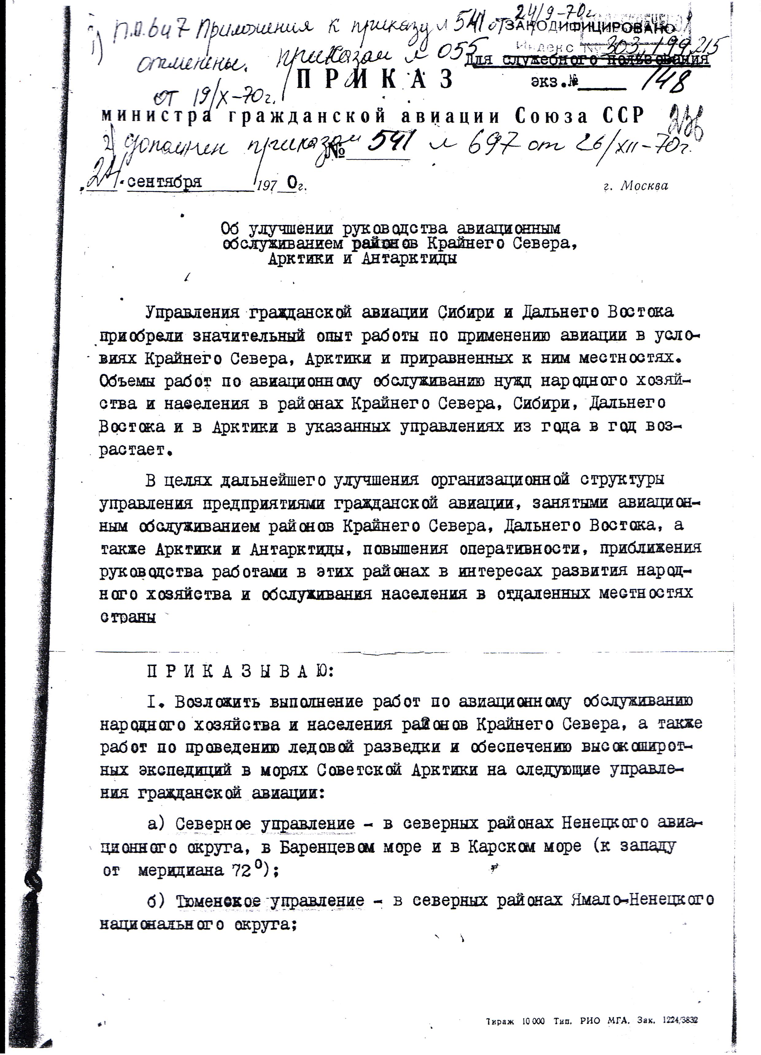 24 сентября 1970 г. был подписан исторический приказ министра Гражданской авиации СССР Б.П. Бугаева №541 "Об улучшении руководства авиационным обслуживанием районов Крайнего Севера, Арктики и Антарктиды", согласно которому Полярное управление Гражданской авиации с 1 января 1971 г. расформировывалось, а задачи по "выполнению работ по авиационному обслуживанию народного хозяйства и населения районов Крайнего Севера, а также работ по проведению ледовой разведки и обеспечению высокоширотных экспедиций в морях Северной Арктики", "формирование сводных Антарктических авиаотрядов..." возлагались на шесть территориальных управлений ГА.