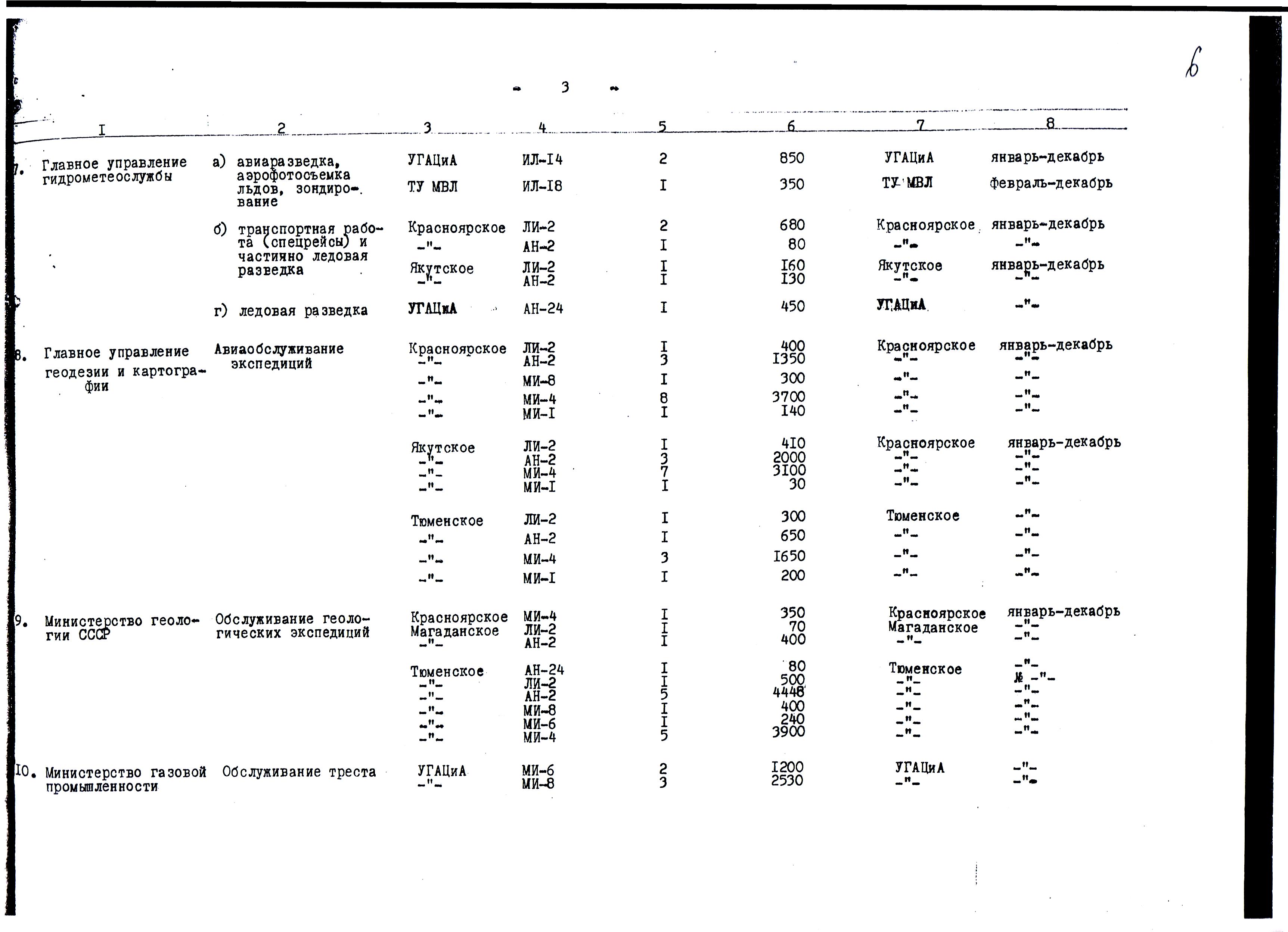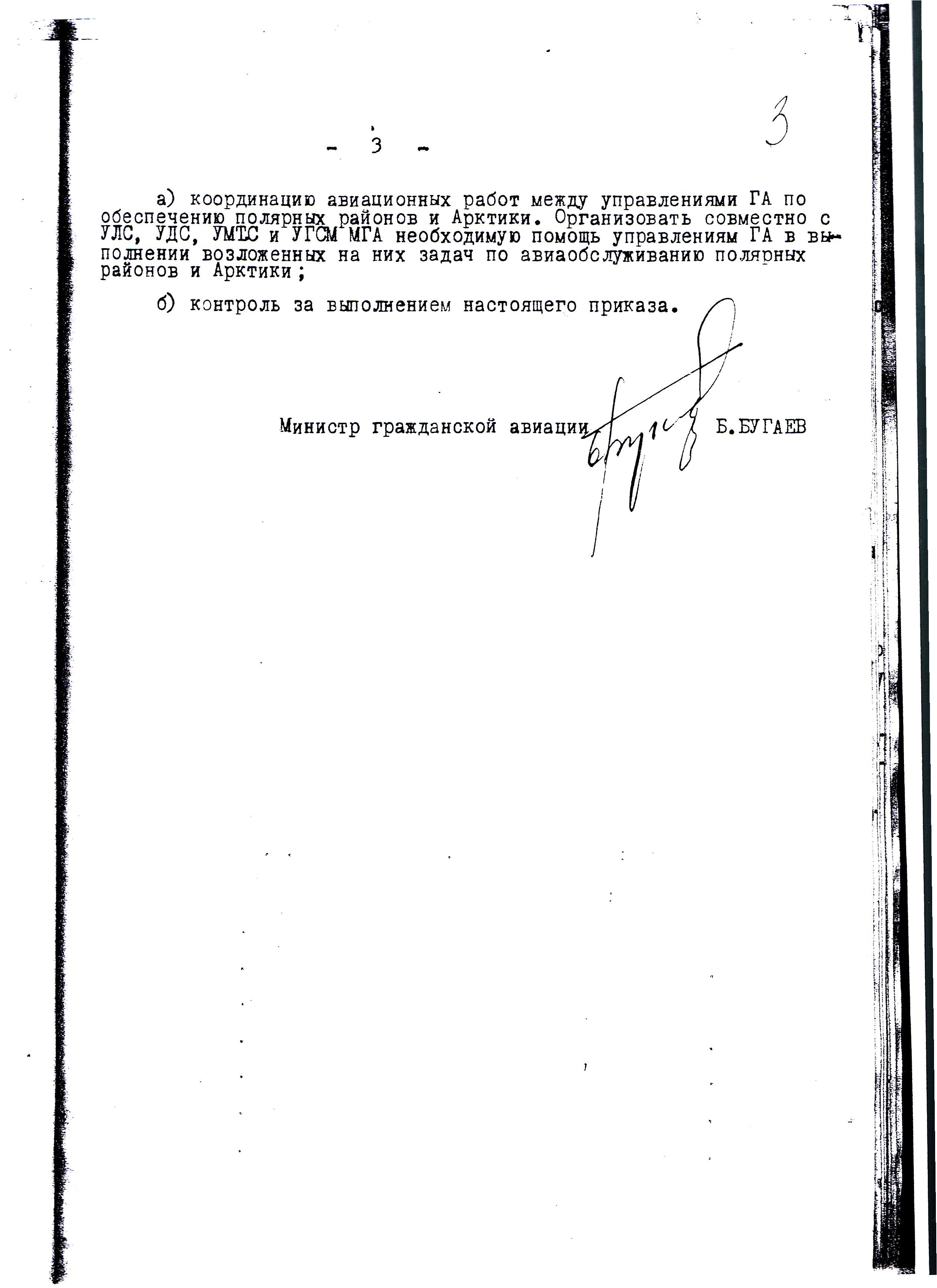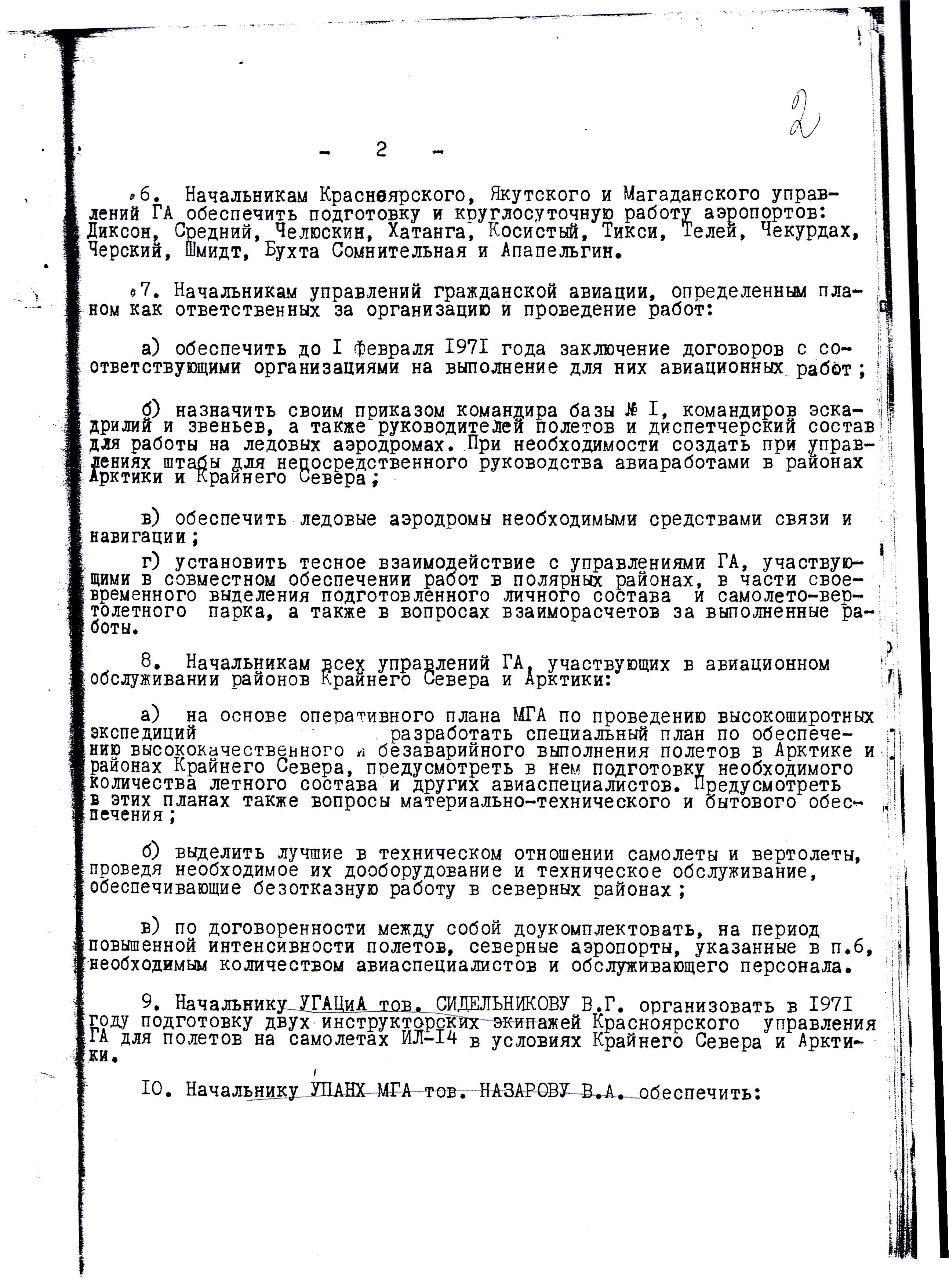 Л. 1-6. № Р-100. 05.06.1970 г. Об итогах работы ВШЭ «Север-70» и поощрении работников предприятий ПУГА. Во исполнение пр. МГА в период март-май предприятиями ПУГА проведена ВШЭ «Север-70». За период работы экспедиции самолёты и вертолёты Полярного управления обеспечили выполнение большой научной программы на дрейфующих льдах Центрального полярного бассейна и прибрежных морей Северного Ледовитого океана. Сложные м/у нынешней зимы, неоднократное торошение и выход из строя ледовых аэродромов сильно осложняли работу личного состава. Несмотря на указанные трудности, личный состав экспедиции проявил мужество и высокую дисциплину, без лётных происшествий успешно справился с поставленными задачами: налетал 10636 час, перевезено 2058т грузов, в т.ч. 1060 т. ГСМ и 430 человек личного состава. На дрейфующий лёд с подбором площадок с воздуха самолётами АН-2, ЛИ-2 совершено более 1627 первичных посадок. На дрейфующие станции СП-16, СП-18, СП-19 произведена смена личного состава и доставлено туда продукты питания, ГСМ и научное оборудование, а станция СП-20 была открыта вновь. Помимо этого, в Ледовитом океане поставлено 52 долговременных автоматических радиометеорологических станций. Научные организации, участвующие в экспедиции дали высокую оценку работы авиационным подразделениям.
