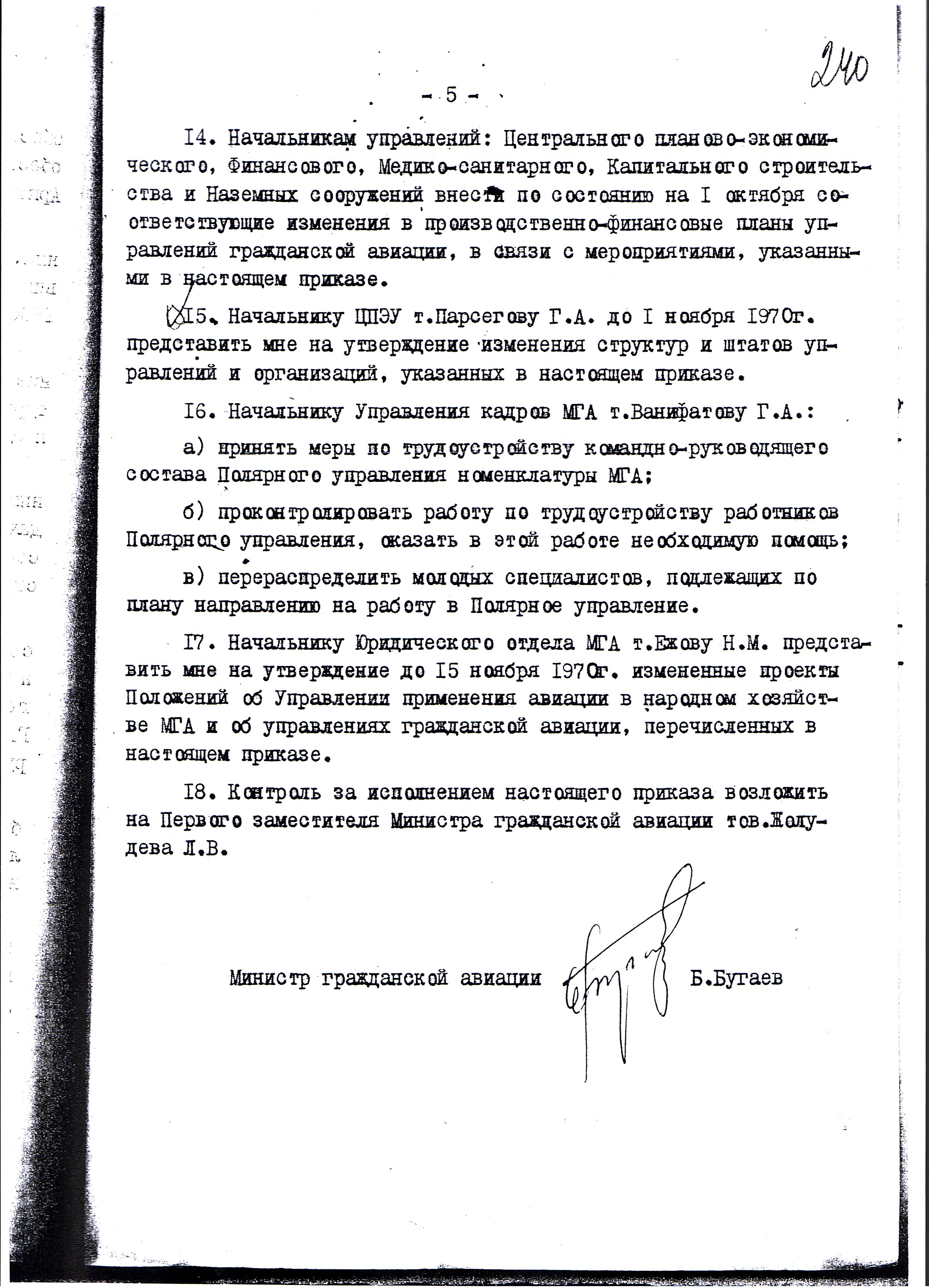 Л. 1-6. № Р-100. 05.06.1970 г. Об итогах работы ВШЭ «Север-70» и поощрении работников предприятий ПУГА. Во исполнение пр. МГА в период март-май предприятиями ПУГА проведена ВШЭ «Север-70». За период работы экспедиции самолёты и вертолёты Полярного управления обеспечили выполнение большой научной программы на дрейфующих льдах Центрального полярного бассейна и прибрежных морей Северного Ледовитого океана. Сложные м/у нынешней зимы, неоднократное торошение и выход из строя ледовых аэродромов сильно осложняли работу личного состава. Несмотря на указанные трудности, личный состав экспедиции проявил мужество и высокую дисциплину, без лётных происшествий успешно справился с поставленными задачами: налетал 10636 час, перевезено 2058т грузов, в т.ч. 1060 т. ГСМ и 430 человек личного состава. На дрейфующий лёд с подбором площадок с воздуха самолётами АН-2, ЛИ-2 совершено более 1627 первичных посадок. На дрейфующие станции СП-16, СП-18, СП-19 произведена смена личного состава и доставлено туда продукты питания, ГСМ и научное оборудование, а станция СП-20 была открыта вновь. Помимо этого, в Ледовитом океане поставлено 52 долговременных автоматических радиометеорологических станций. Научные организации, участвующие в экспедиции дали высокую оценку работы авиационным подразделениям.