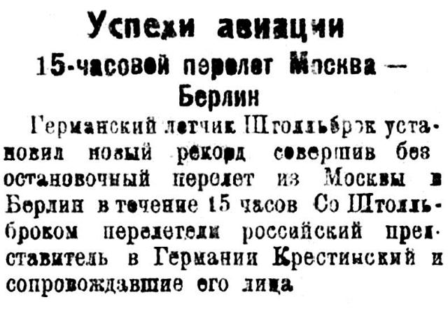 Германский летчик Штолльброк установил новый рекорд совершив без остановочный перелет из Москвы в Берлин в течение 15 часов. Со Штолльброком перелетели российский представитель в Германии Крестинский и сопровождавшие его лица.