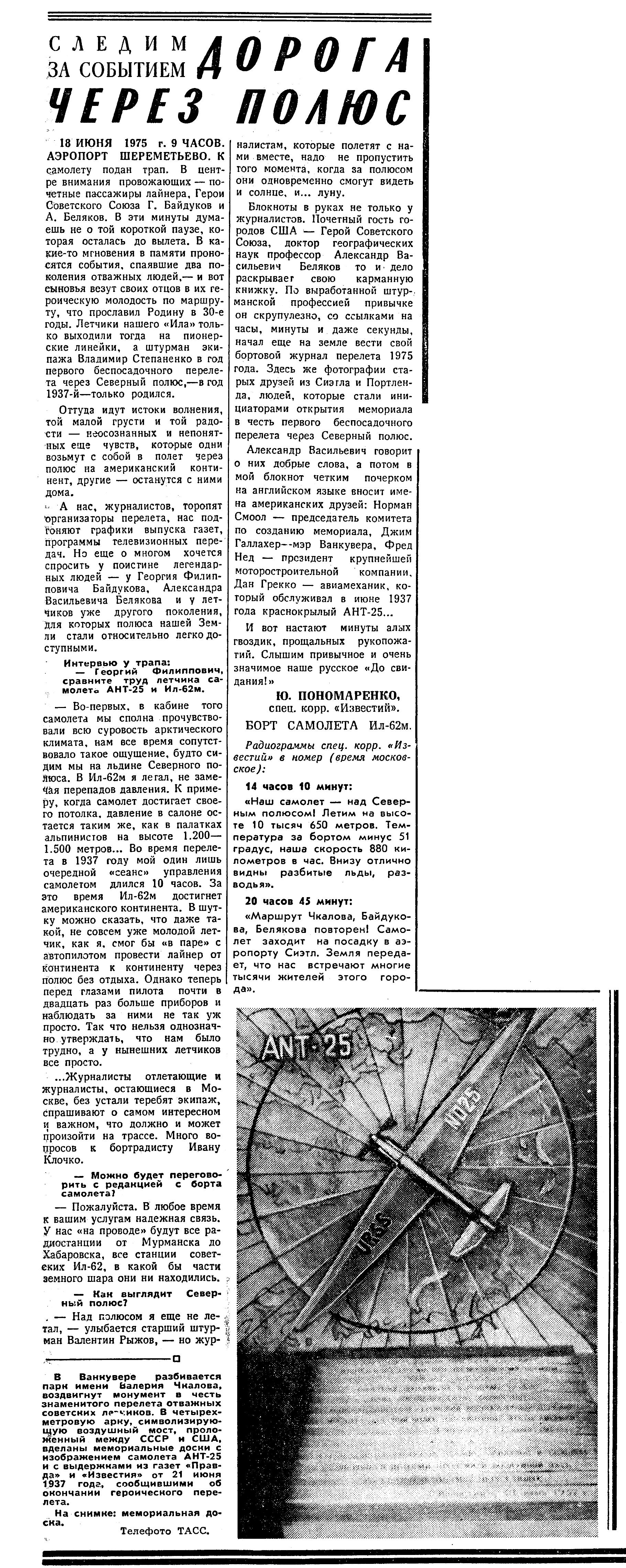 18 ИЮНЯ 1975 г. 9 ЧАСОВ. АЭРОПОРТ ШЕРЕМЕТЬЕВО. К самолету подан трап. В центре внимания провожающих — почетные пассажиры лайнера, Герои Советского Союза Г. Байдуков и А. Беляков. В эти минуты думаешь не о той короткой паузе, которая осталась до вылета. В какие-то мгновения в памяти проносятся события, спаявшие два поколения отважных людей, — и вот сыновья везут своих отцов в их героическую молодость по маршруту, что прославил Родину в 30-е годы. Летчики нашего «Ила» только выходили тогда на пионерские линейки, а штурман экипажа Владимир Степаненко в год первого беспосадочного перелета через Северный полюс, — в год 1937-й — только родился.