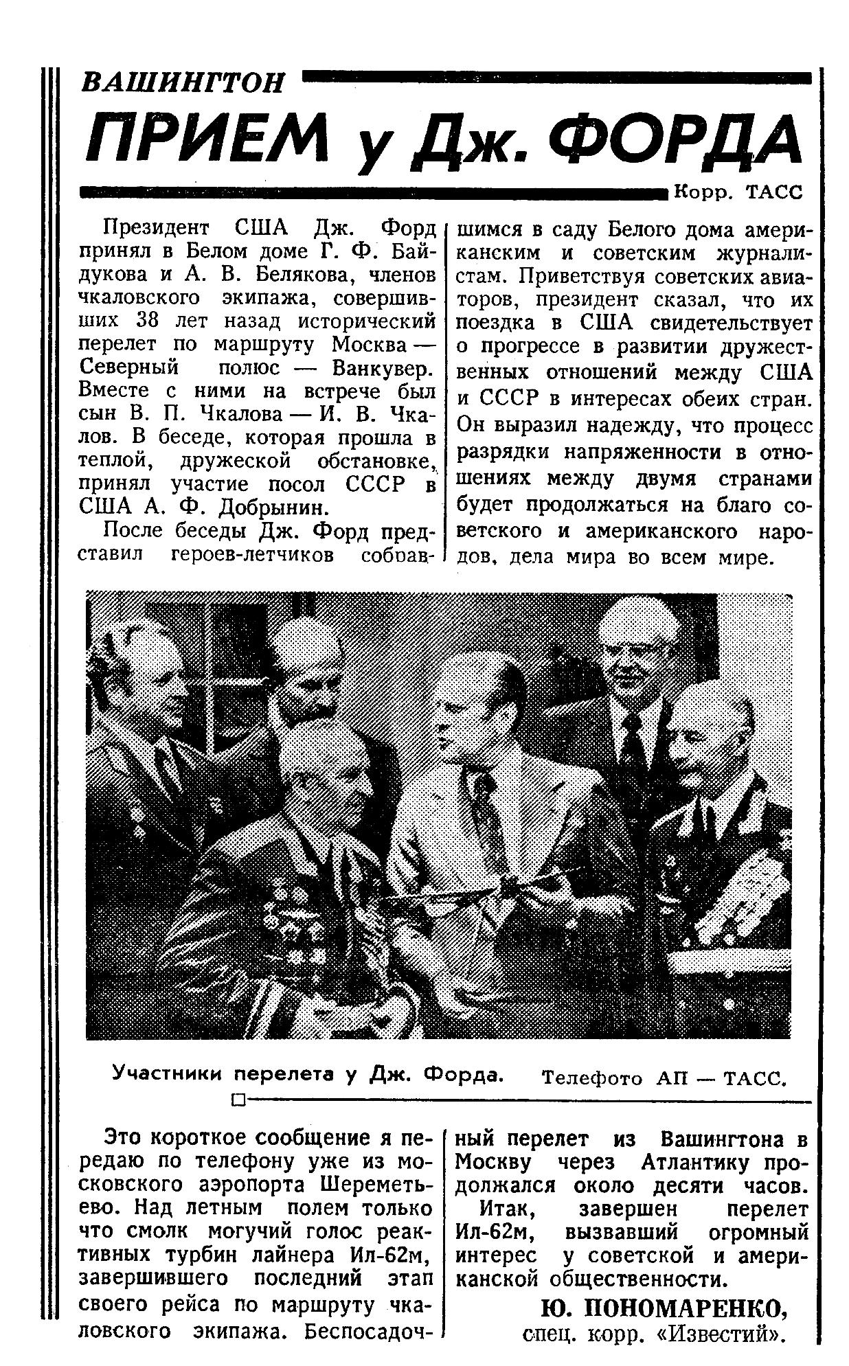 Президент США Дж. Форд принял в Белом доме Г. Ф. Байдукова и А. В. Белякова, членов чкаловского экипажа, совершивших 38 лет назад исторический перелет по маршруту Москва — Северный полюс — Ванкувер. Вместе с ними на встрече был сын В. П. Чкалова — И. В. Чкалов. В беседе, которая прошла в теплой, дружеской обстановке, принял участие посол СССР в США А. Ф. Добрынин.