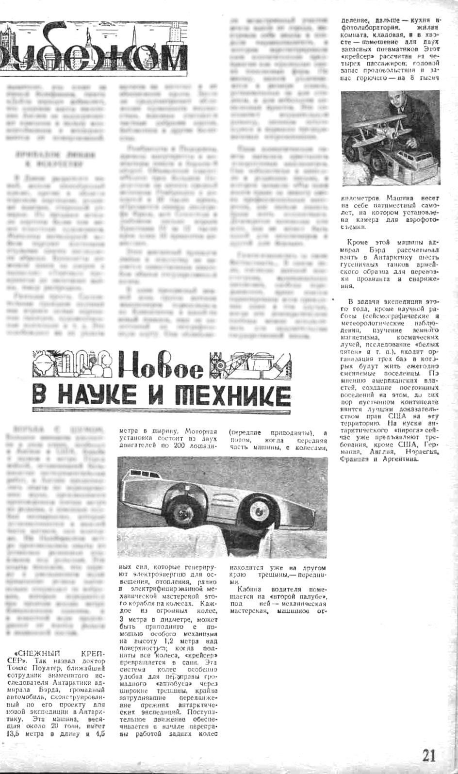 Не будем описывать все перипетии разгрузки Snow Cruiser в Антарктиде, скажем лишь, что колеса тяжелой машины, погружавшиеся в снег более чем на 0,9 метра, начинали беспомощно прокручиваться, а двигатели перегревались. Снег, в отличие от асфальта, проминался, и колеса все время оказывались в яме, а выехать из нее не хватало мощности. Единственной возможностью пройти хотя бы 148 километров оказалось… движение задним ходом (спасибо «правильной» развесовке носа и кормы, а также профилю днища и свесам). Впрочем, существование в уютных каютах рядом с теплыми дизелями оказалось весьма комфортным, и крейсер встал на вечный прикол в качестве базы для полярников. Потом его занесло снегом, и лишь длинный бамбуковый шест выдавал место «подземного» лагеря. Потом война отодвинула полярные исследования на второй план, и только в 1958 году машину откопали, посмотрели и уехали. А еще через пару лет она вдруг исчезла! По одной из версий, крейсер откололся вместе с ледником, уплыл в море и там утонул. Вторая (более экзотическая, но не то чтобы вовсе невероятная): коварные русские, мол, украли машину для изучения и увезли ее в Сибирь. Во всяком случае, так писали некоторые газеты той поры. А может быть, его просто не слишком хорошо искали?