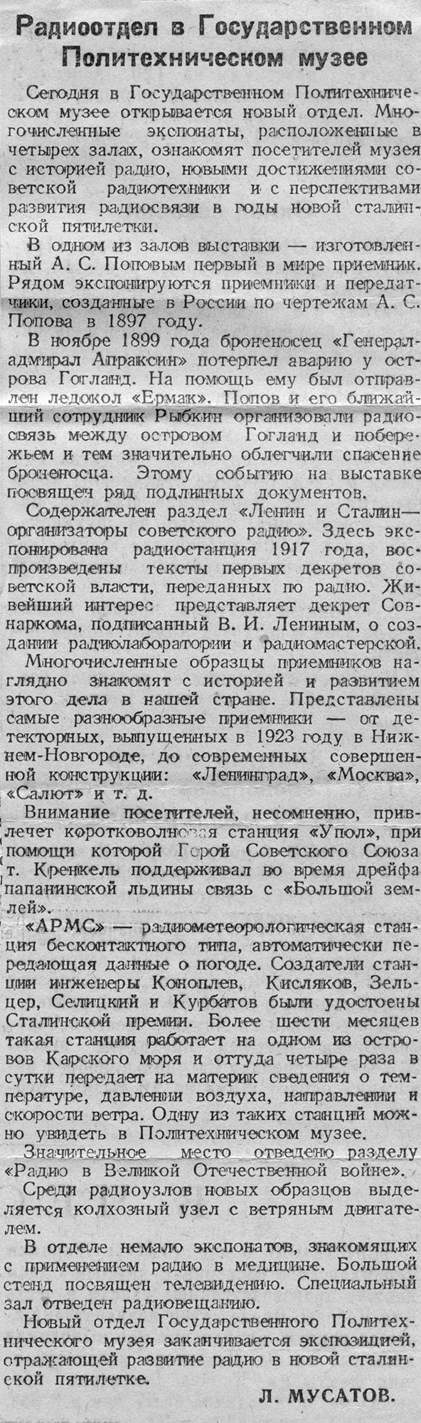 Сегодня в Государственном Политехническом музее открывается новый отдел. Многочисленные экспонаты, расположенные в четырех залах, ознакомят посетителей музея с историей радио, новыми достижениями советской радиотехники и с перспективами развития радиосвязи в годы новой сталинской пятилетки.