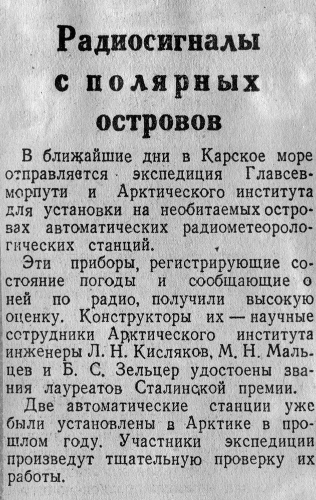 Эти приборы, регистрирующие состояние погоды и сообщающие о ней по радио, получили высокую оценку. Конструкторы их — научные сотрудники Арктического института инженеры Л. Н. Кисляков, М. Н. Мальцев и Б. С. Зельцер удостоены звания лауреатов Сталинской премии.