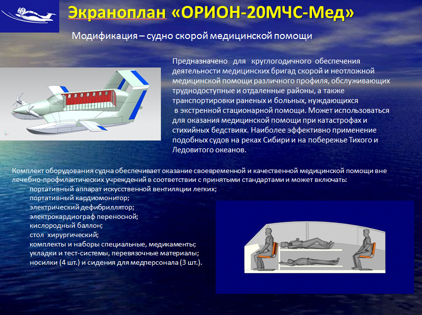 Экраноплан «Орион-20» создала и ведёт испытания «Ассоциация разработчиков, производителей и потребителей экранопланов «ЭКРАНОПЛАН» (г.Москва). Предполагается, что машина в перспективе будет активно применяться в т.ч. в Арктике.