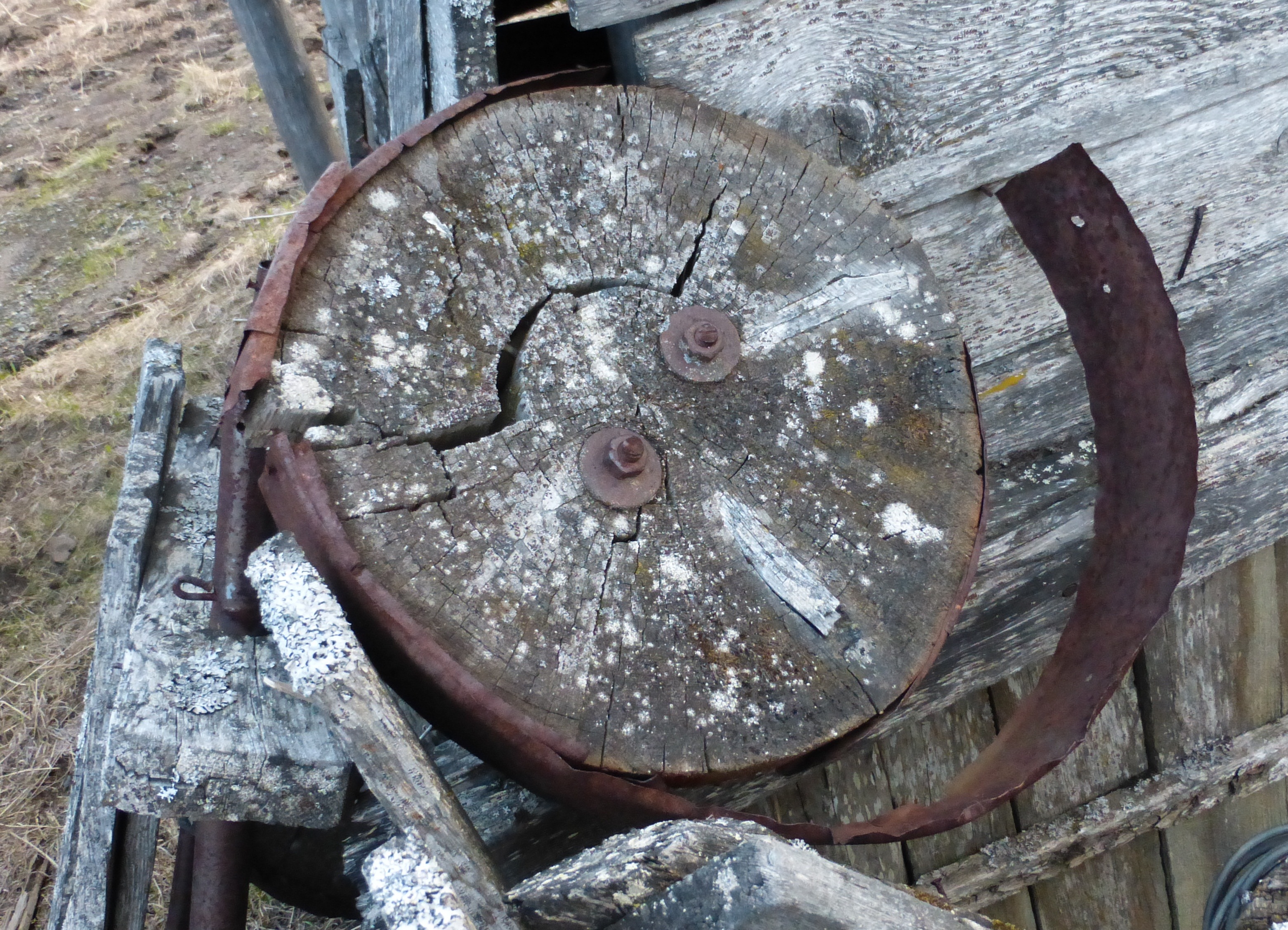 Недавно ездил на охоту к своему другу на избушку в деревню Нарыга, что в 18 км севернее Нарьян-Мара. Деревня разделена на старую и новую деревню. Как то пошел я в новую деревню, по фотографировать, а за одно и познакомиться с тем районом Нарыги и удного из домов, обнаружил присланенную к забору полуразвалившуюся тележку. Тележка, как тележка, а вот колеса деревянные, с наружи обитые лентами метала, жаль хозяина на месте небыло, только фото удалось сделать.