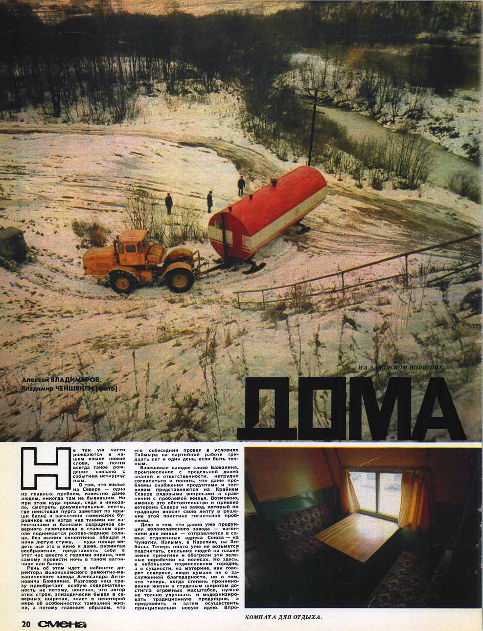 Владимиров А. Дома для севера//Смена № 5(1147), Март 1975 с.20-23Не так уж часто рождаются в нашем языке новые слова, но почти всегда такое рождение связано с событием незаурядным. О том, что жилье на Севере – одна из главных проблем, известно даже людям, никогда там не бывавшим. Но при этом куда проще, сидя в кинозале, смотреть документальные ленты, где неистовая пурга заметает по крыши балки и вагончики тюменских буровиков или когда над такими же вагончиками и балками сварщиков северного газопровода в стальном ореоле поднимается розово-ледяное солнце, без всяких синоптиков обещая к ночи лютую стужу, – куда проще видеть все это в кино и даже, разжигая воображение, представлять себя в этот час вместе с героями экрана, чем самому провести ночь в таком вагончике или балке.