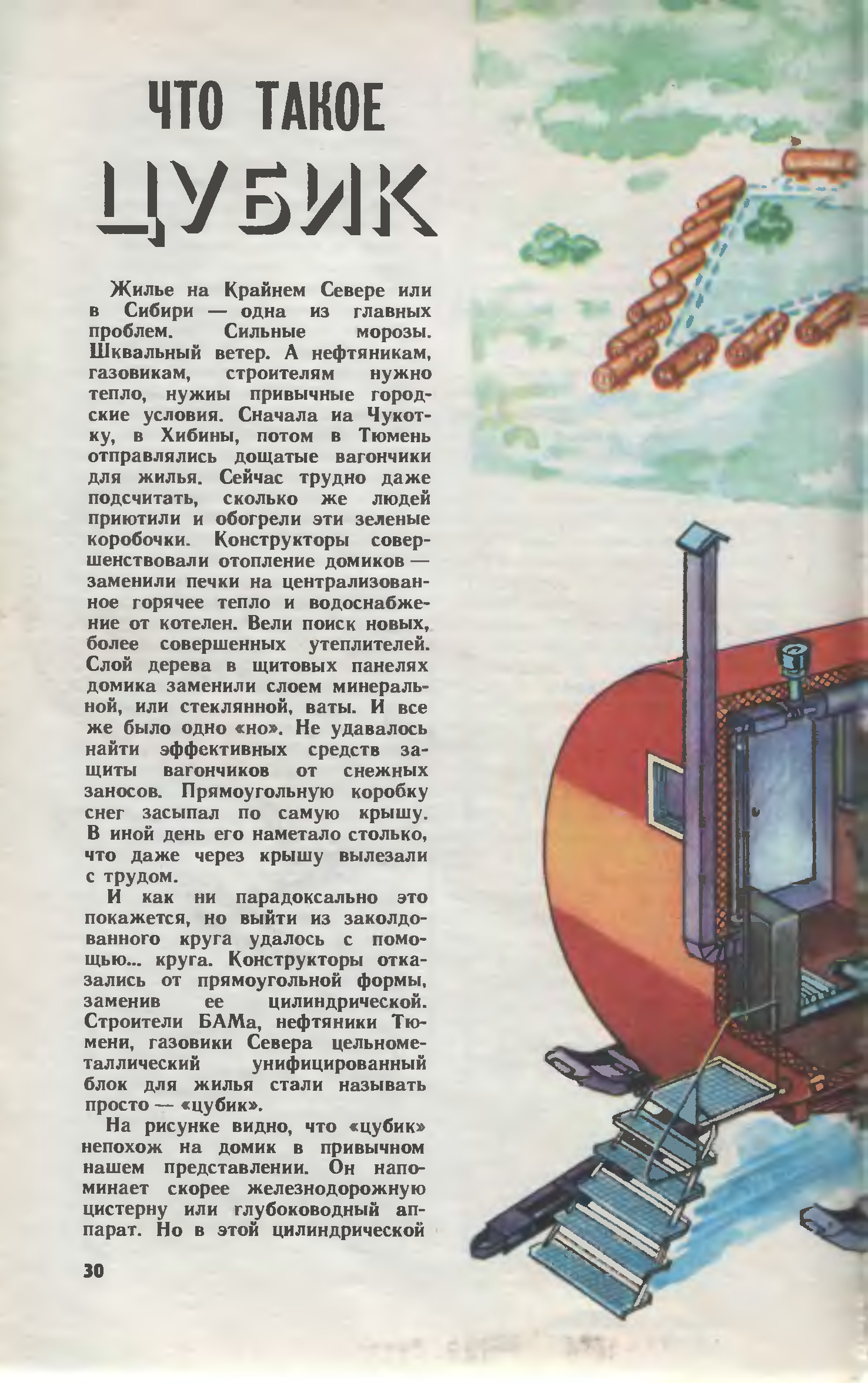 Не станем, однако, длить список рационализаторских предложений, внесенных рабочими и инженерами завода в рождение любимого (теперь уже можно так сказать) детища, ибо тогда нам придется «пройтись» чуть ли не по всей технологии изготовления «цубика», посмотрим на него в том законченном виде, каким приходит домик к своим хозяевам. Даже при беглом взгляде на эти снимки видно, что «цубик» вовсе не похож на дом в привычном нашем представлении. Вытянутый и поставленный горизонтально красно-серый цилиндр напоминает скорее железнодорожную цистерну на колесах (или лыжах – в зависимости от условий транспортировки). Но это не прихоть конструкторов, а зерно идеи, которая полностью решает проблему пурги и гарантирует домик от снежных заносов. Снежные заряды любой плотности и силы свободно обтекают металлический цилиндр, толстые тройные окна которого делают его похожим на глубоководный снаряд с иллюминаторами.
