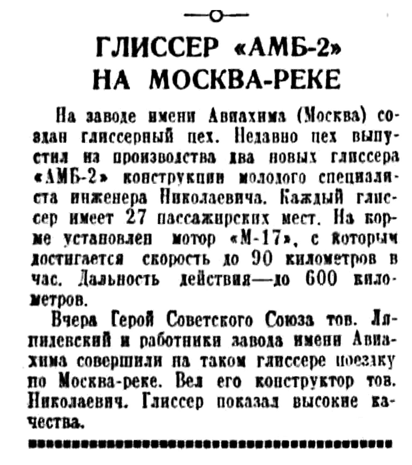 На заводе имени Авиахима (Москва) создан глиссерный цех. Недавно цех выпустил из производства два новых глиссера «АМБ-2» конструкции молодого специалиста инженера Николаевича. Каждый глиссер имеет 27 пассажирских мест. На корме установлен мотор «М-17», с которым достигается скорость до 90 километров в час. Дальность действия — до 600 километров.
