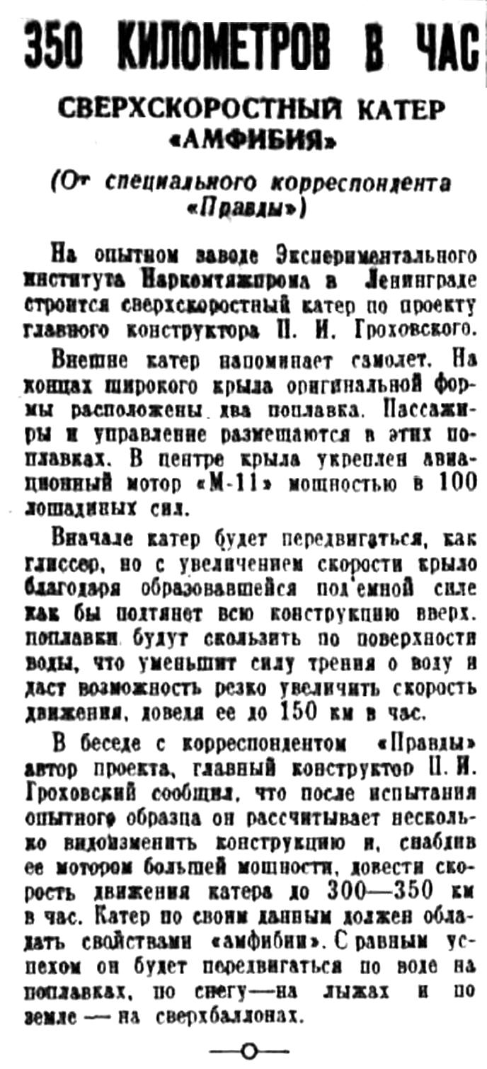 Вчера Герой Советского Союза тов. Ляпидевский и работники завода имени Авиахима совершили на таком глиссере поездку по Москва-реке. Вел его конструктор тов. Николаевич. Глиссер показал высокие качества.