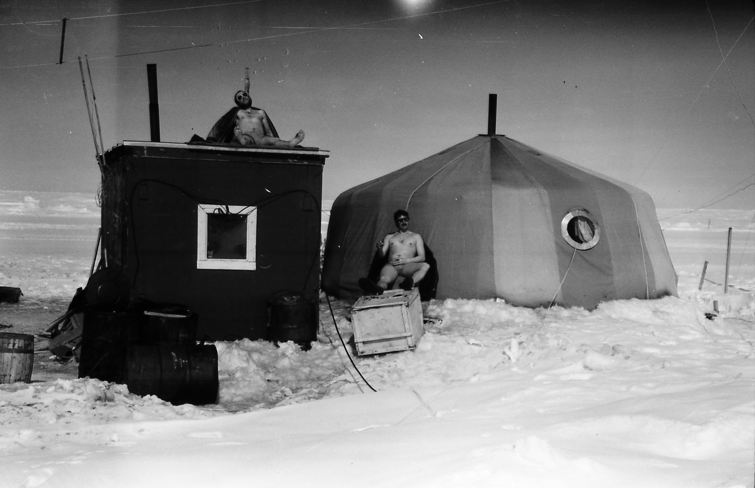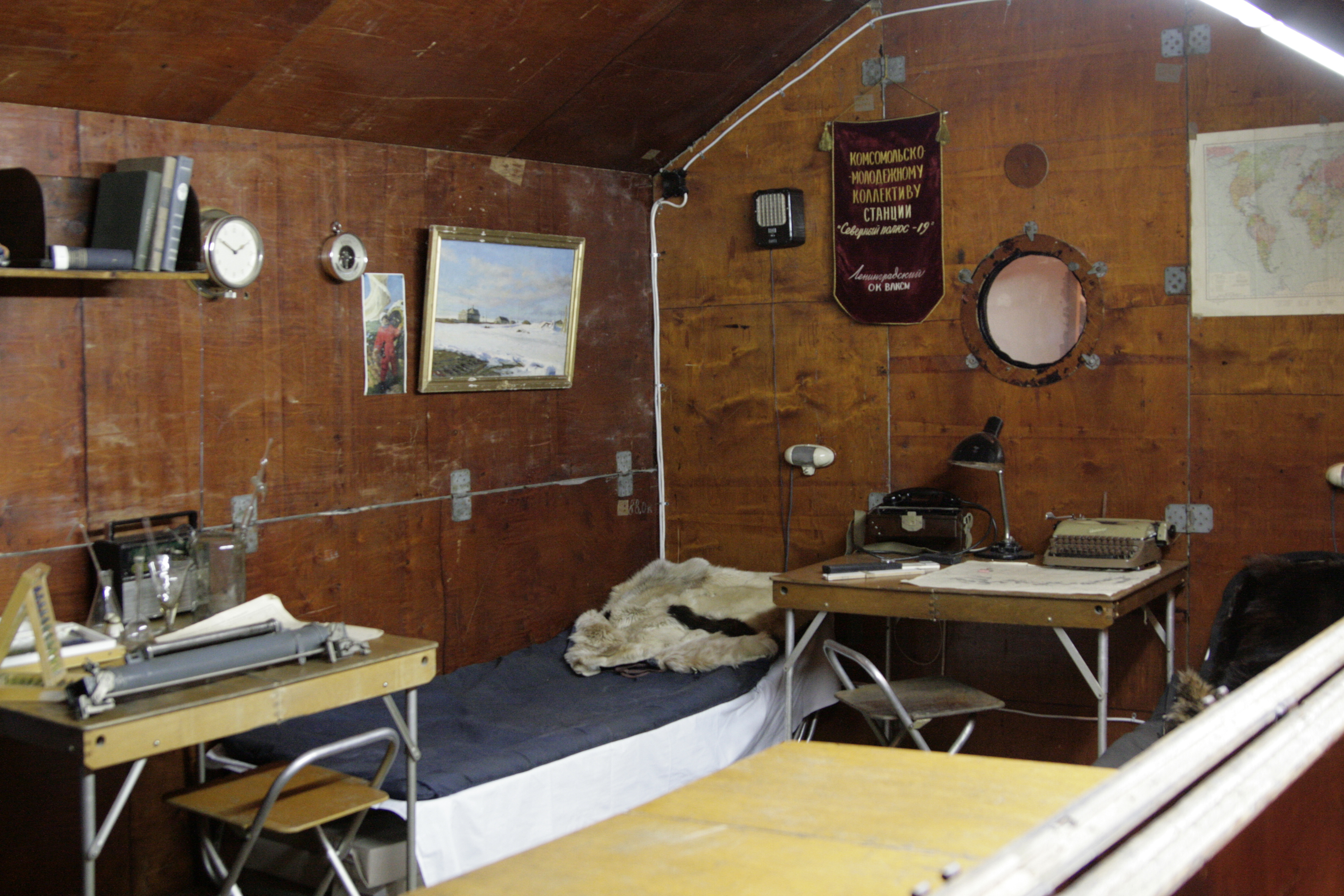 "На "тридцатке" стали эксплуатировать новый тип домиков - собираемых из крупногабаритных щитов и используемых на "материке" как времянки. При высадке станции с ледокола такие габариты не проблема, но при эвакуации станции самолетами, как это было в на «тридцатке», такие домики бросили все, хотя и ПДКО много осталось на льду. (Помнится в ПДКО станционных радистов, откуда я работал после их убытия в конце эвакуации, написал нитрокраской. во всю стену свой почтовый адрес - пока никто ничего не прислал (!)) В таком домике на ледовом аэродроме, жили РП и диспетчер. Два радиста и радиотехник жили в "юрте". Это довольно удобное и вместительное помещение состоящее из дюралевого сборного каркаса с натянутыми на него тремя (кажется?) слоями изолирующего и утепляющего материала. Вместо пола оленьи шкуры закрытые листами фанеры. Печка "АПСНЫ" посредине, вентилятор под потолком, три раскладушки и "пианина" новой разработки по периметру. В "юрте" получались неплохие условия для жизни и работы. Возможно зимой в ней могло быть холодно, но весной - вполне комфортно. Можно было ходить в тапочках."