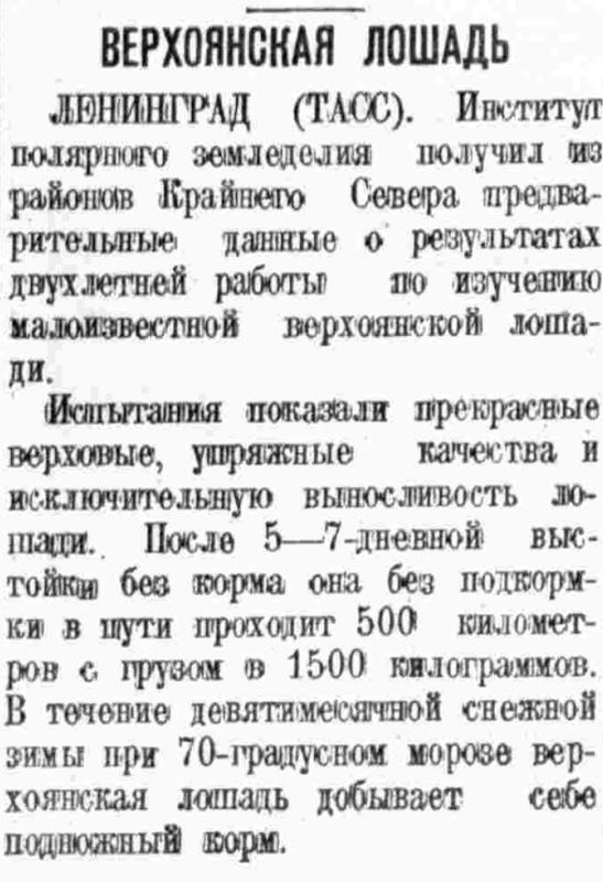 ЛЕНИНГРАД (ТАСС). Институт полярного земледелия получил из районов Крайнего Севера предварительные данные о результатах двухлетней работы по изучению малоизвестной верхоянской лошади.