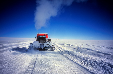 A Kassbohrer breaking trail ahead of the sled trains. There are two people on board as the work required to control the blade is pretty tiring and drivers need to change every two hours. This vehicle is also in charge of navigation, so the satellite positioning systems and navigating software must be in use at all times. - Kassbohrer прокладывает дорогу следующему позади санному поезду. В кабине - два человека, т.к. работа требующая контроля лезвия довольно утомительна и водители должны меняться каждые два часа. Вездеход также отвечает за навигацию, поэтому спутниковая система позиционирования и навигационное ПО также необходимо постоянно использовать.