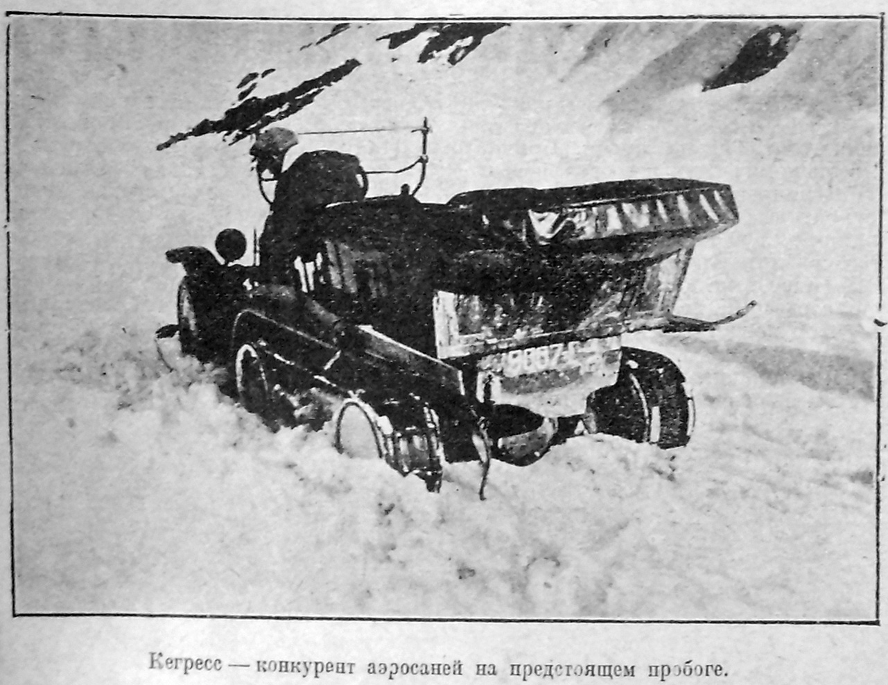 Автомобиль, достигший высокой степени совершенства, позволяет считать его вполне надежным средством во все времена года в районах, обеспеченных хорошими дорогами, но он малонадежен и беспомощен в глубоком снегу. Кегресс, могущий ползать по всякой дороге, во всякое время года, должен будет тратить непомерно много времени, очутившись в безграничных просторах Сибири. Аэросани, могущие в кратчайший срок покрывать снежные пустыни Сибири, будут бездействовать без снега и принесут мало пользы на коротких расстояниях в 10—20 километров.