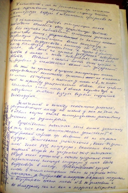 Судя по описанию , в подмасочное пространство подавался теплый воздух от калорифера, который висел на поясе , на одной из масок было двойное стекло, куда тоже подавался теплый воздух. Электропитание осуществлялось по 35-метровому электрошнуру.