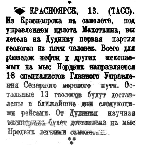 КРАСНОЯРСК, 13. (ТАСС). Из Красноярска на самолете, под управлением пилота Махоткина, вылетела на Дудинку первая партия геологов из пяти человек. Всего для разведок нефти и других ископаемых на мыс Нордвик направляется 18 специалистов Главного Управления Северного морского пути. Остальные 13 геологов будут доставлены в ближайшие дни следующими рейсами. От Дудинки научная экспедиция будет доставлена на мыс Нордвик легкими самолетами.