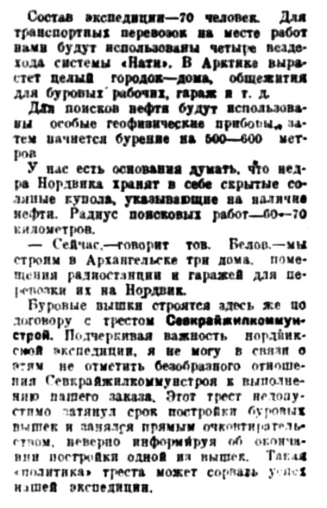 На Нордвике велись буровые работы. Поиски нефти для судов великого Северного морского пути составляли основную задачу, возложенную на большую группу рабочих и буровых мастеров. В ноябре 1934 года начальник буровых работ Полуянов закончил сооружение первой вышки.