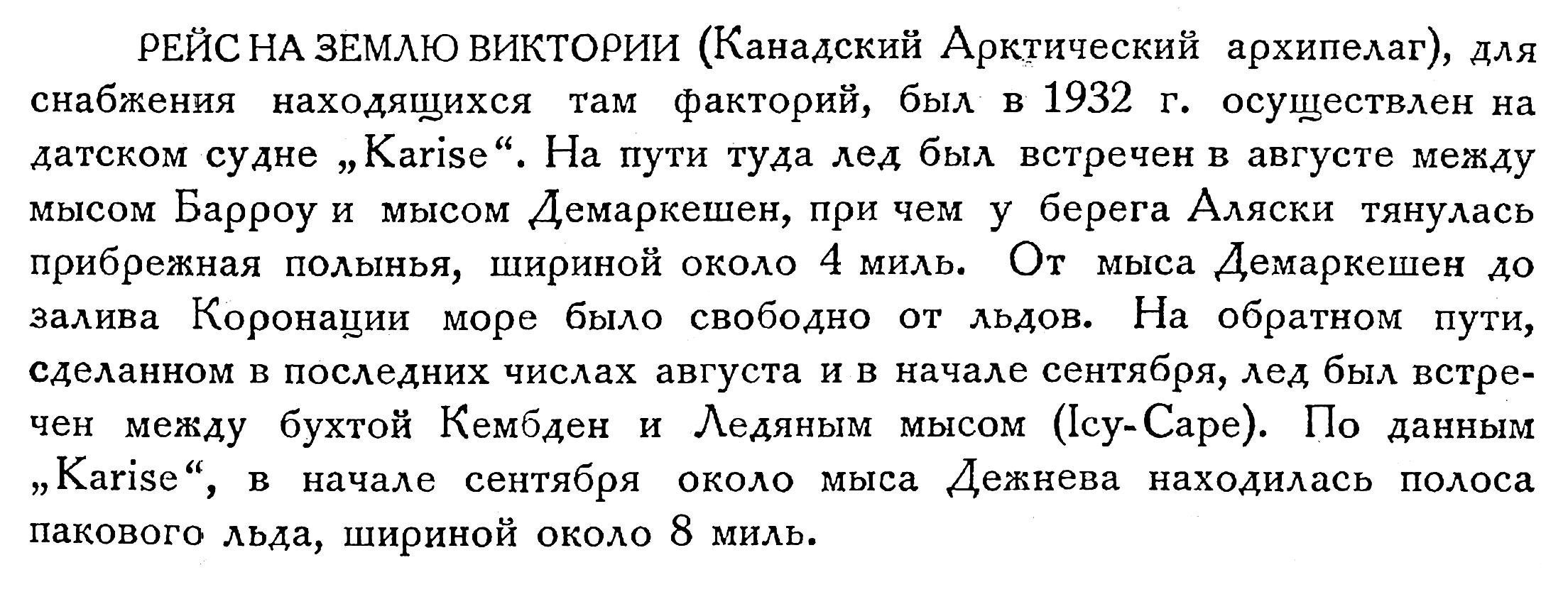 РЕЙС НА ЗЕМЛЮ ВИКТОРИИ (Канадский Арктический архипелаг), для снабжения находящихся там факторий, был в 1932 г. осуществлен на датском судне "Karise". На пути туда лед был встречен в августе между мысом Барроу и мысом Демаркешен, при чем у берега Аляски тянулась прибрежная полынья, шириной около 4 миль. От мыса Демаркешен до залива Коронации море было свободно от льдов. На обратном пути, сделанном в последних числах августа и в начале сентября, лед был встречен между бухтой Кембден и Ледяным мысом (Icy-Саре). По данным "Karise", в начале сентября около мыса Дежнева находилась полоса пакового льда, шириной около 8 миль.