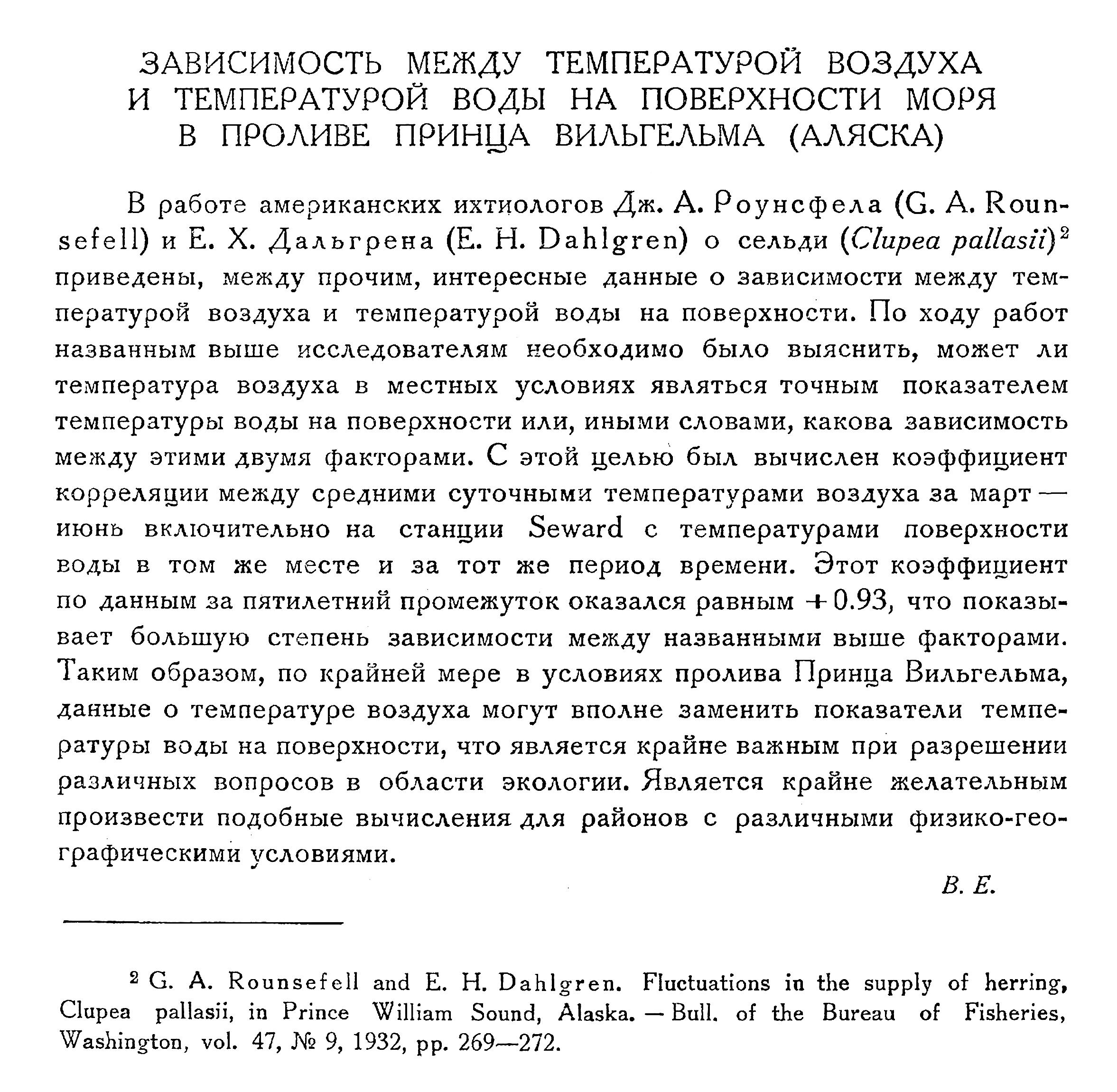 В работе американских ихтиологов Дж. А. Роунсфела (G. A. Rounsefell) и Е. X. Дальгрена (Е. H. Dahlgren) о сельди (Clupea pallasii) 2) приведены, между прочим, интересные данные о зависимости между температурой воздуха и температурой воды на поверхности. По ходу работ названным выше исследователям необходимо было выяснить, может ли температура воздуха в местных условиях являться точным показателем температуры воды на поверхности или, иными словами, какова зависимость между этими двумя факторами. С этой целью был вычислен коэффициент корреляции между средними суточными температурами воздуха за март — июнь включительно на станции Seward с температурами поверхности воды в том же месте и за тот же период времени. Этот коэффициент по данным за пятилетний промежуток оказался равным + 0. 93, что показывает большую степень зависимости между названными выше факторами. Таким образом, по крайней мере в условиях пролива Принца Вильгельма, данные о температуре воздуха могут вполне заменить показатели температуры воды на поверхности, что является крайне важным при разрешении различных вопросов в области экологии. Является крайне желательным произвести подобные вычисления для районов с различными физико-географическими условиями.