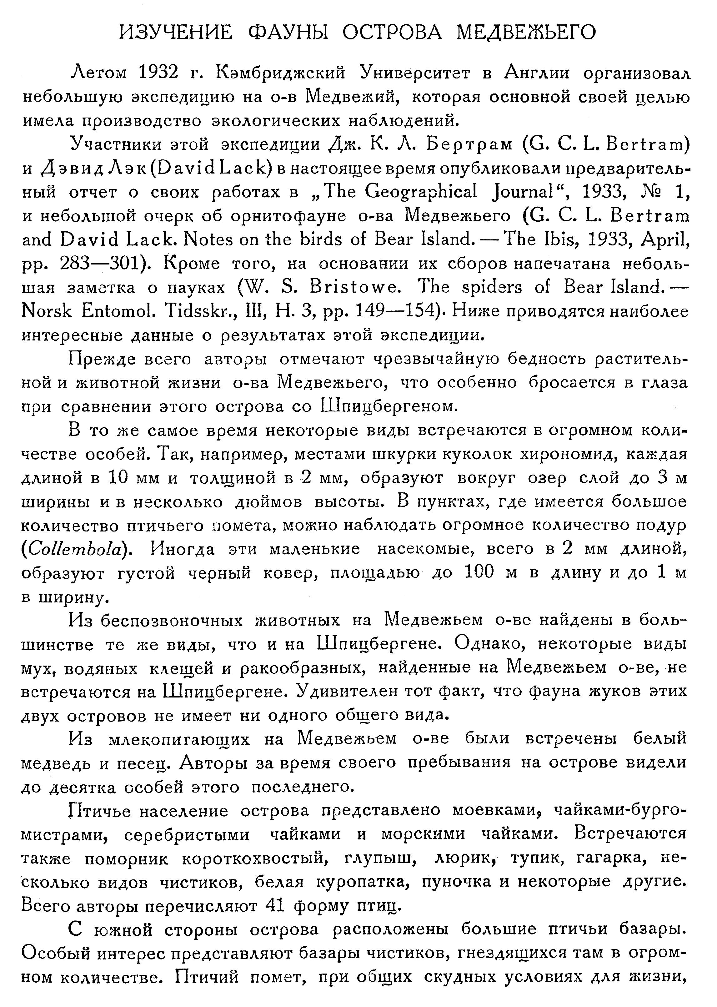 Участники этой экспедиции Дж. К. Л. Бертрам (G. С. L. Bertram) и Дэвид Лэк (David Lack) в настоящее время опубликовали предварительный отчет о своих работах в „The Geographical Journal", 1933, № 1, и небольшой очерк об орнитофауне о-ва Медвежьего (G. С. L. Bertram and David Lack. Notes on the birds of Bear Island. — The Ibis, 1933, April, pp. 283—301). Кроме того, на основании их сборов напечатана небольшая заметка о пауках (W. S. Bristowe. The spiders of Bear Island. — Norsk Entomol. Tidsskr., Ill, H. 3, pp. 149—154). Ниже приводятся наиболее интересные данные о результатах этой экспедиции.