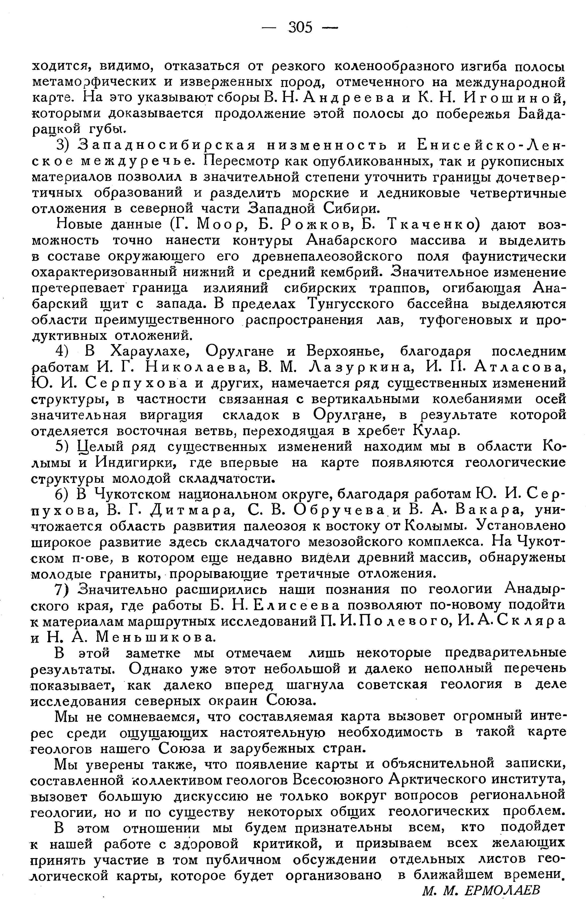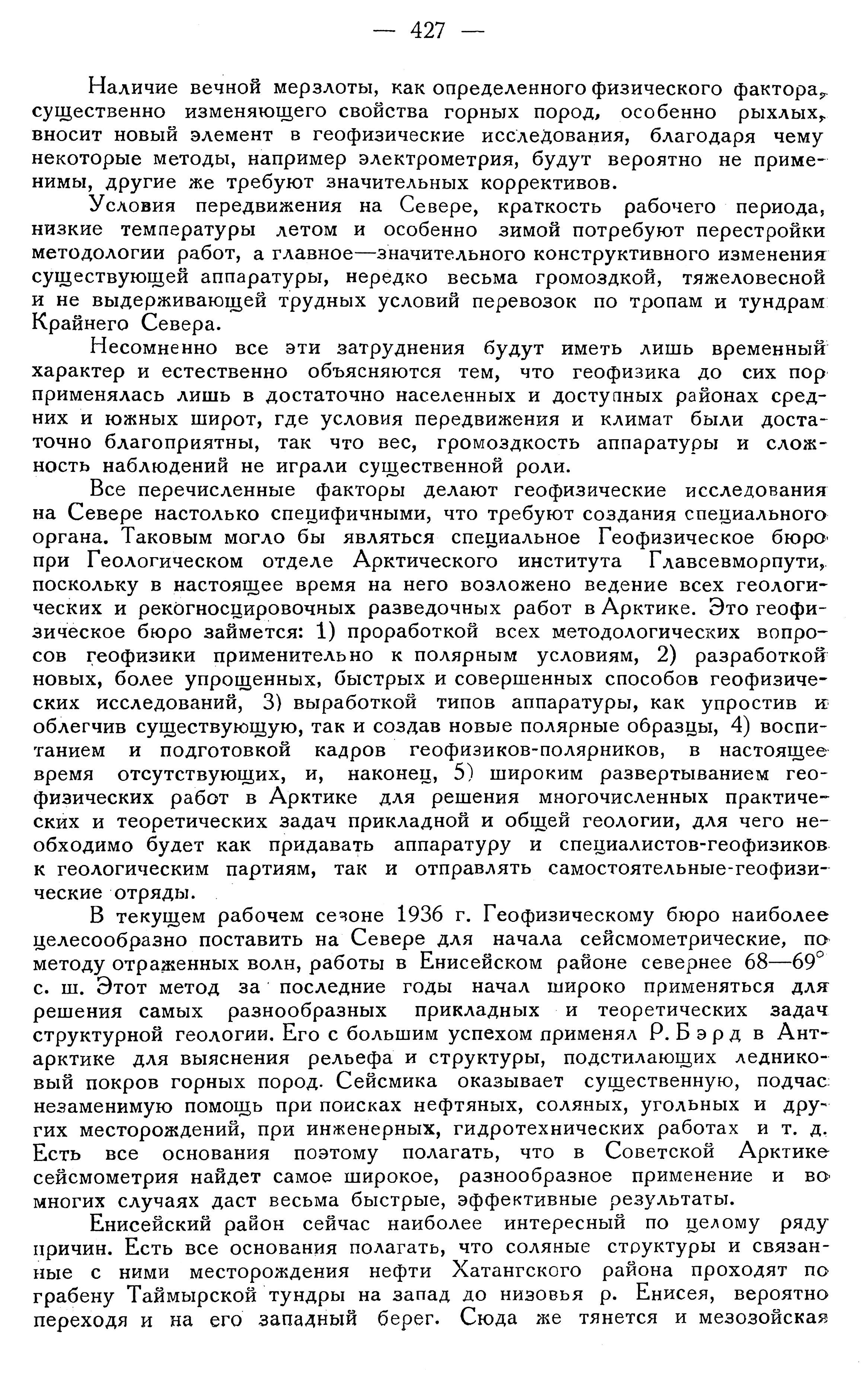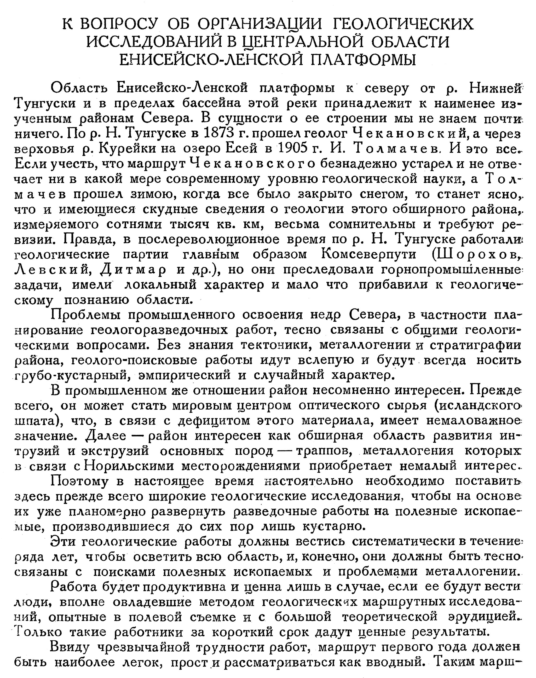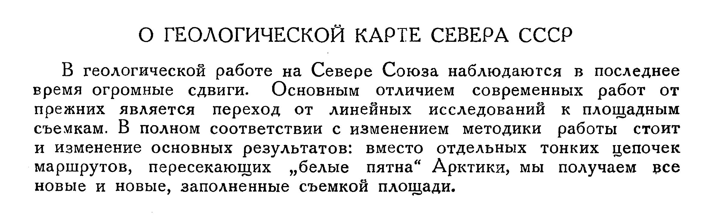 Отставание научно-исследовательской работы от задач социалистического освоения Арктики требует коренной перестройки направления, характера и содержания всей научной деятельности института. В ближайшие годы необходимо подвести серьезную, основательную научную базу под все растущую и бурно развивающуюся горнопромышленную деятельность в Арктике. Изучение недр Советского Севера должно проводиться на основе достаточно углубленного геологического исследования и в первую очередь площадной геологической съемки. В Арктике следует широко применять все новейшие достижения науки в области геологических исследований и раз навсегда отказаться от полукустарных методов работы.