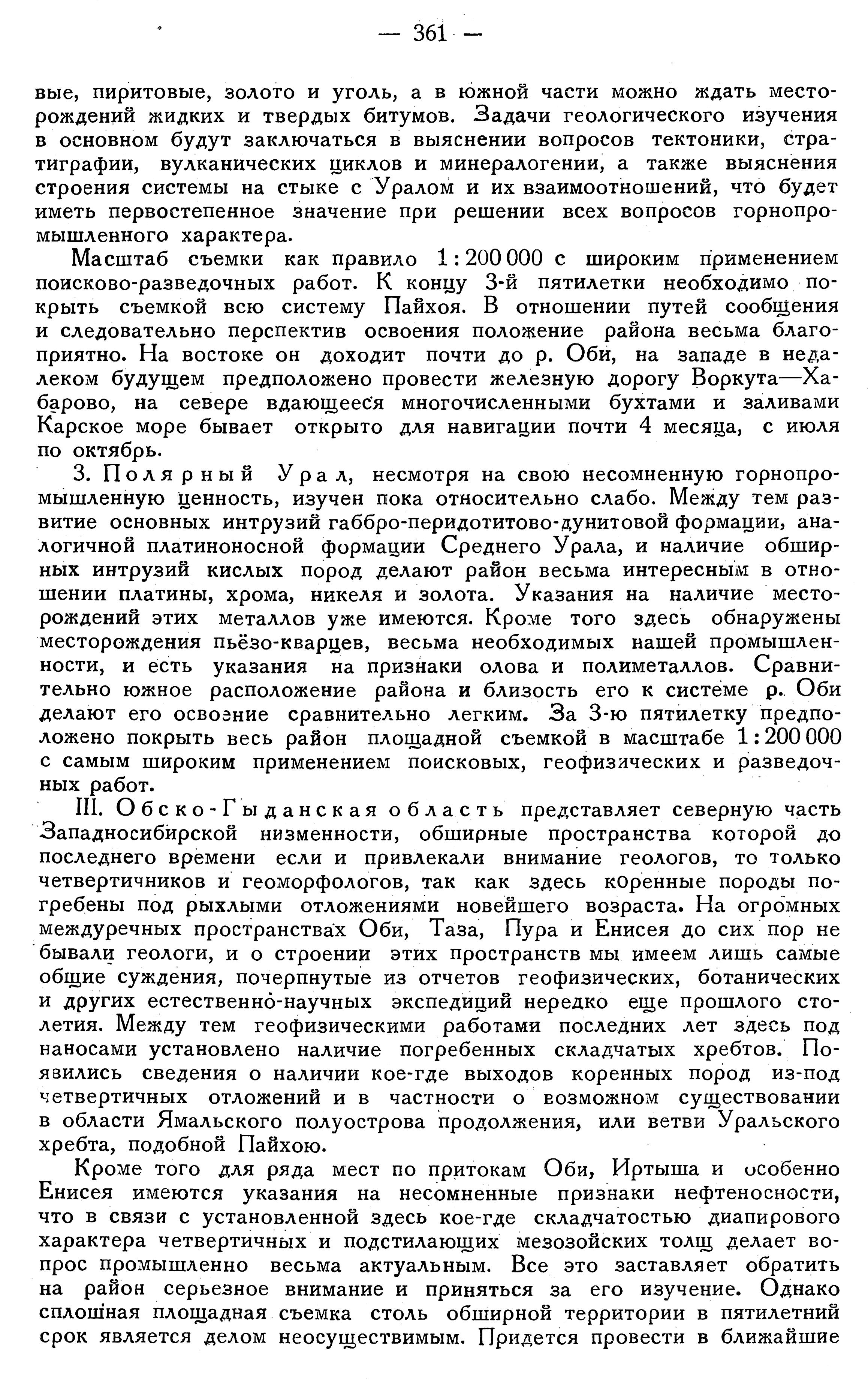 Полярный Урал, несмотря на свою несомненную горнопромышленную ценность, изучен пока относительно слабо. Между тем развитие основных интрузий габбро-перидотитово-дунитовой формации, аналогичной платиноносной формации Среднего Урала, и наличие обширных интрузий кислых пород делают район весьма интересным в отношении платины, хрома, никеля и золота. Указания на наличие месторождений этих металлов уже имеются. Кроме того здесь обнаружены месторождения пьёзо-кварцев, весьма необходимых нашей промышленности, и есть указания на признаки олова и полиметаллов. Сравнительно южное расположение района и близость его к системе р. Оби делают его освоение сравнительно легким. За 3-ю пятилетку предположено покрыть весь район площадной съемкой в масштабе 1:200 000 с самым широким применением поисковых, геофизических и разведочных работ.
