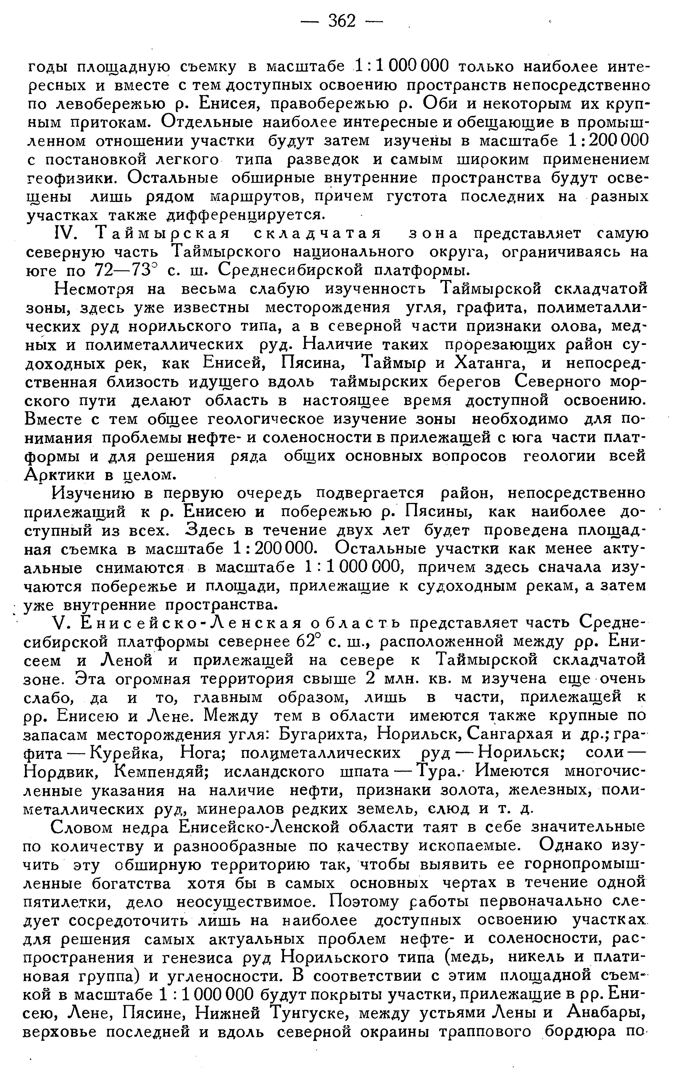 Словом недра Енисейско-Ленской области таят в себе значительные по количеству и разнообразные по качеству ископаемые. Однако изучить эту обширную территорию так, чтобы выявить ее горнопромышленные богатства хотя бы в самых основных чертах в течение одной пятилетки, дело неосуществимое. Поэтому работы первоначально следует сосредоточить лишь на наиболее доступных освоению участках для решения самых актуальных проблем нефте- и соленосности, распространения и генезиса руд Норильского типа (медь, никель и платиновая группа) и угленосности. В соответствии с этим площадной съемкой в масштабе 1: 1000 000 будут покрыты участки, прилежащие в рр. Енисею, Лене, Пясине, Нижней Тунгуске, между устьями Лены и Анабары, верховье последней и вдоль северной окраины траппового бордюра по